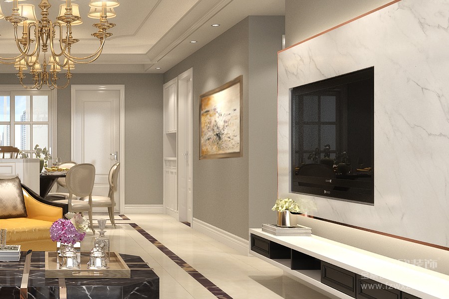 電視背景墻無過多造作,一整墻大理石紋理清晰,簡單中盡顯大氣質(zhì)感。架高的小臺面方便放一些花草、雜志或裝飾畫等,細(xì)節(jié)處處體現(xiàn)用心。