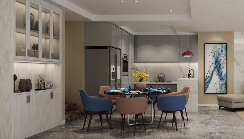 設(shè)計(jì)理念|本案在整體設(shè)計(jì)效果上,采用簡(jiǎn)約現(xiàn)代的手法設(shè)計(jì),主色使用灰白色系,再加以米白色提亮整個(gè)空間溫度,用藍(lán)色的餐椅和吧臺(tái)燈點(diǎn)綴空間色彩。造型上,客廳電視背景墻采用立體石塊,增加空間立體感受。裝飾上,一切從功能出發(fā),講究造型比例適度、空間結(jié)構(gòu)圖明確美觀,強(qiáng)調(diào)外觀的明快、簡(jiǎn)潔。體現(xiàn)了現(xiàn)代生活快節(jié)奏、簡(jiǎn)約和實(shí)用,但又富有朝氣的生活氣息。