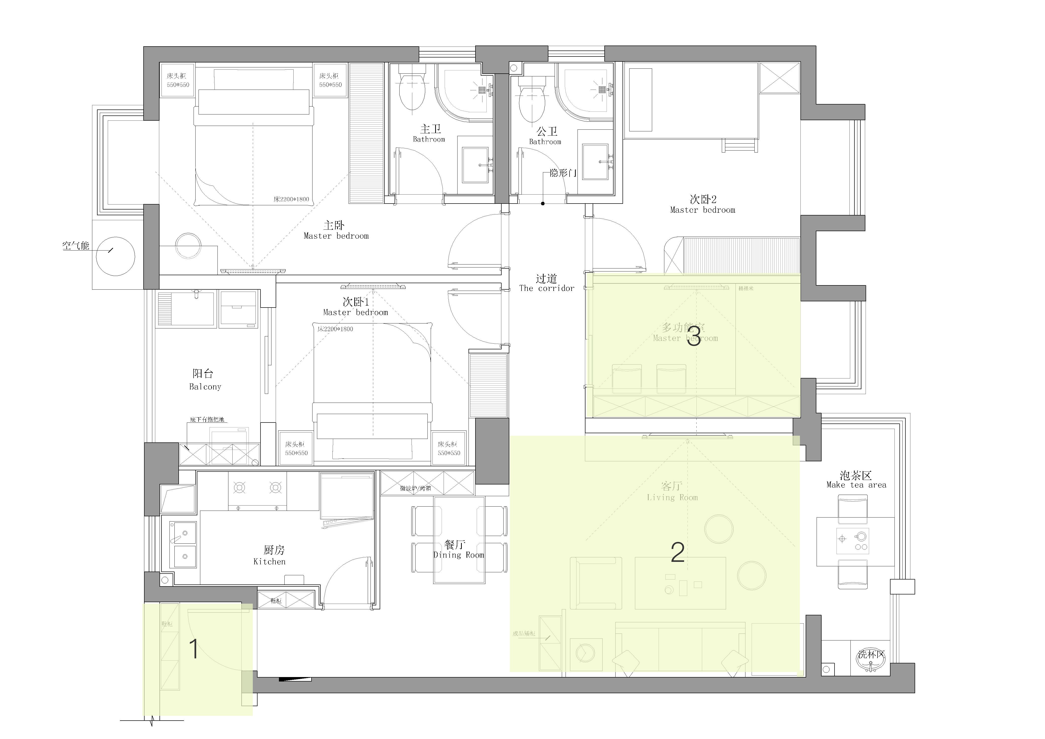 ③ 將靠近客廳位置的臥室設(shè)計成集娛樂、閱讀、休息于一體的多功能空間。動靜空間分離非常明晰。
