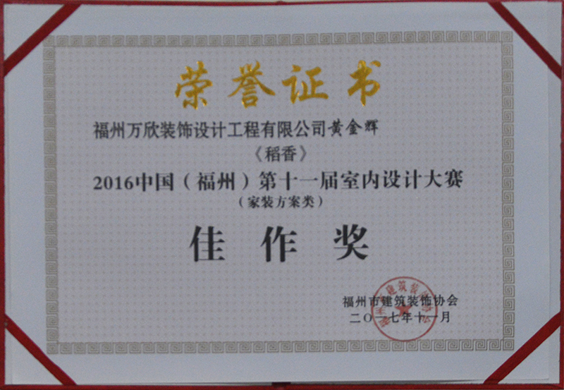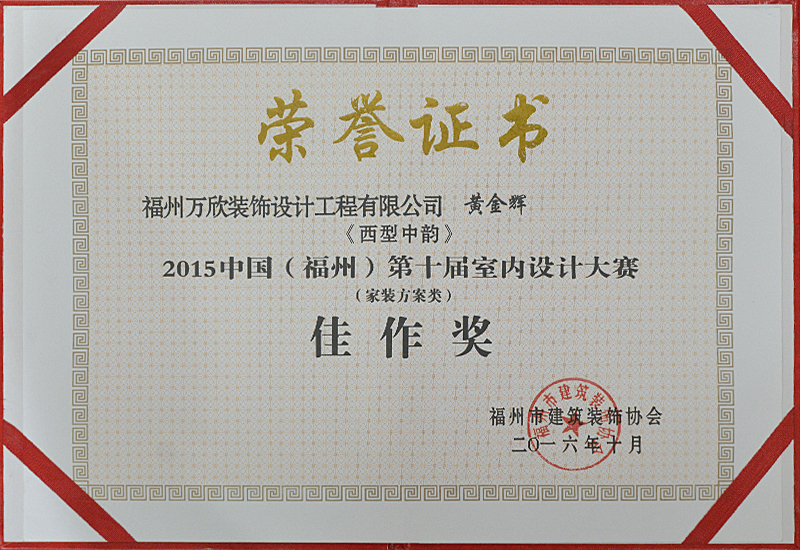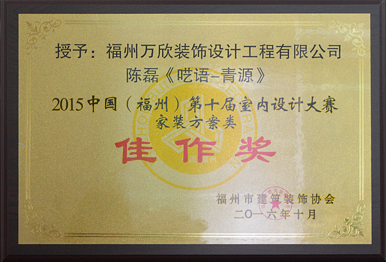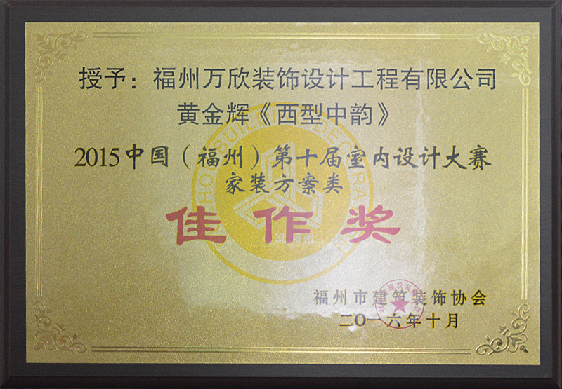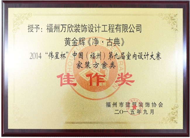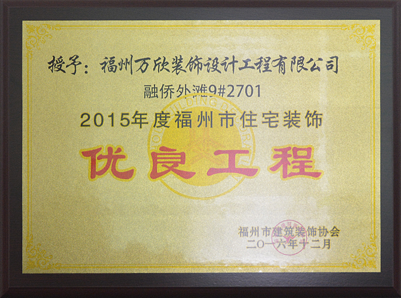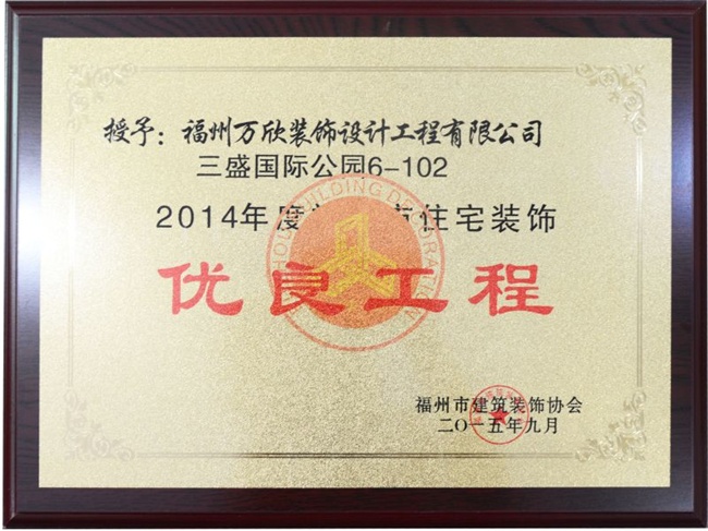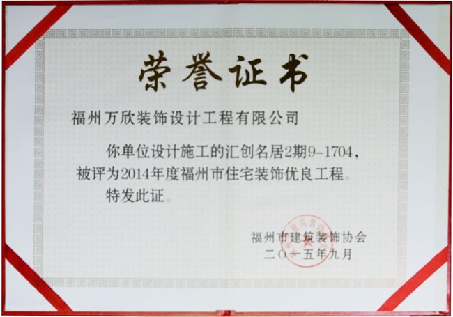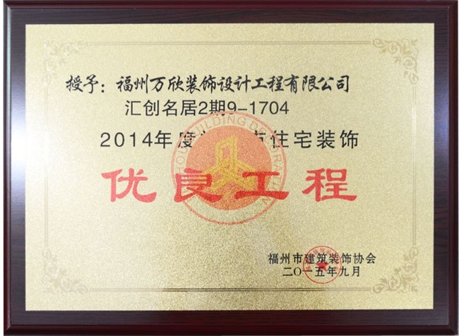- >福州市裝協(xié)授予萬(wàn)欣裝飾“匯創(chuàng)二期47#104”為福州住宅裝飾優(yōu)良工程