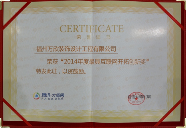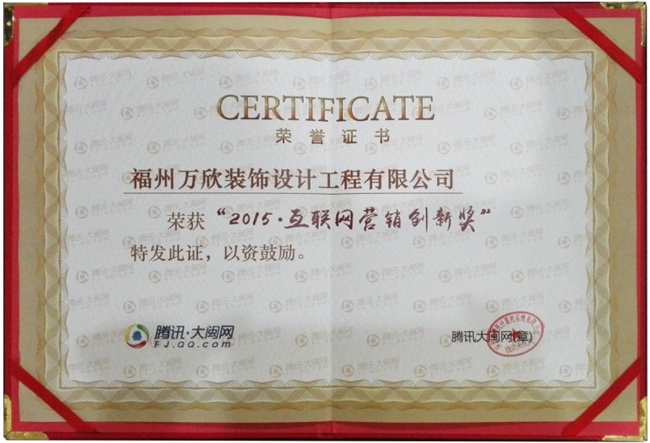 - >騰訊大閩網(wǎng)授予萬(wàn)欣裝飾"2015·互聯(lián)網(wǎng)營(yíng)銷創(chuàng)新獎(jiǎng)"