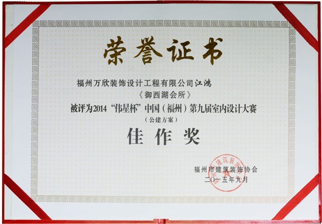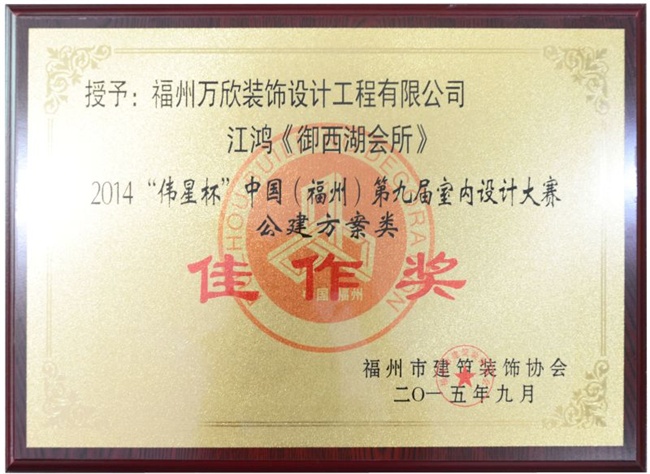 - >萬(wàn)欣裝飾作品《御西湖會(huì)所》被評(píng)為中國(guó)(福州)第九屆室內(nèi)設(shè)計(jì)大賽(公建方案)佳作獎(jiǎng)