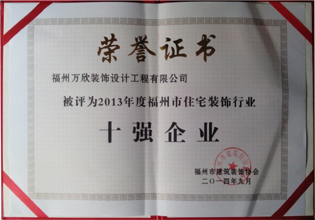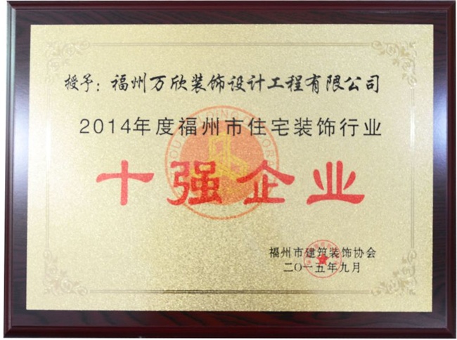- >福州市建筑裝飾協(xié)會(huì)授予萬(wàn)欣裝飾2014年度福州市住宅裝飾行業(yè)十強(qiáng)企業(yè)