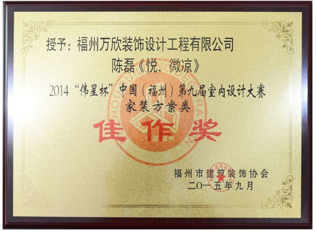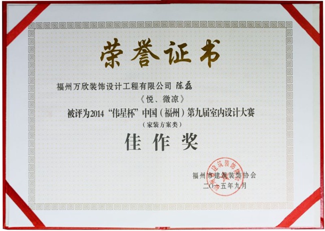- >萬(wàn)欣裝飾作品《悅、微涼》被評(píng)為中國(guó)(福州)第九屆室內(nèi)設(shè)計(jì)大賽(家裝方案類)佳作獎(jiǎng)