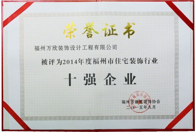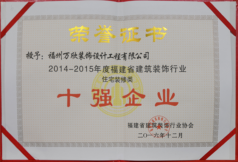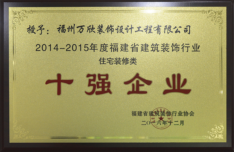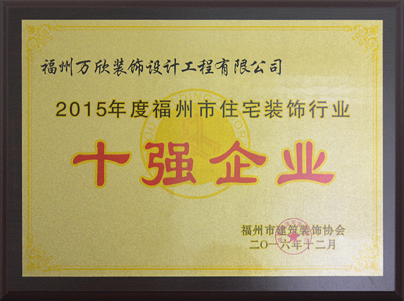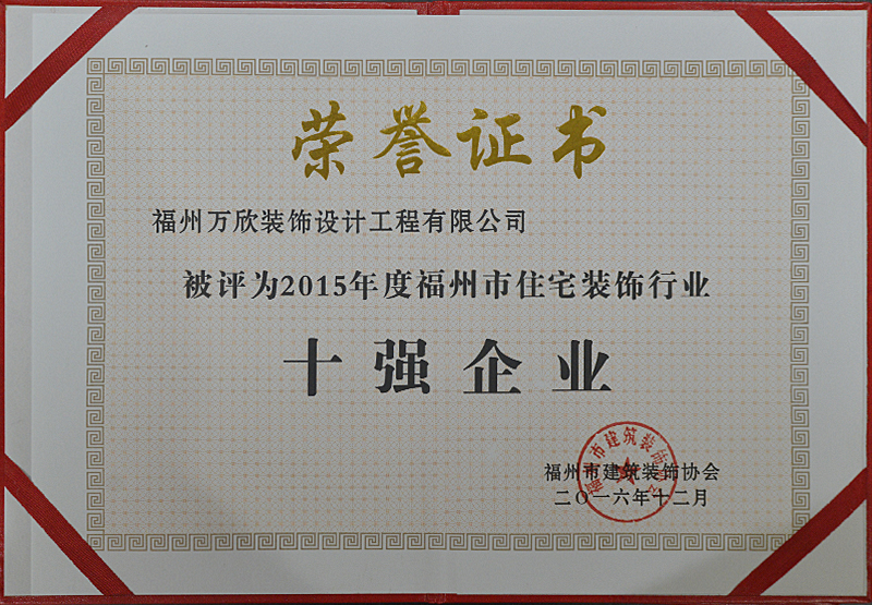 - >萬(wàn)欣裝飾被評(píng)為2015年度福州市住宅裝飾行業(yè)十強(qiáng)企業(yè)