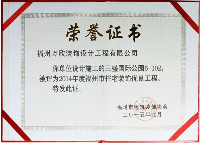 - >三盛國(guó)際公園6-102被福州市建筑裝飾協(xié)會(huì)評(píng)為2014年度福州市住宅裝飾"優(yōu)良工程"