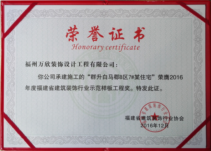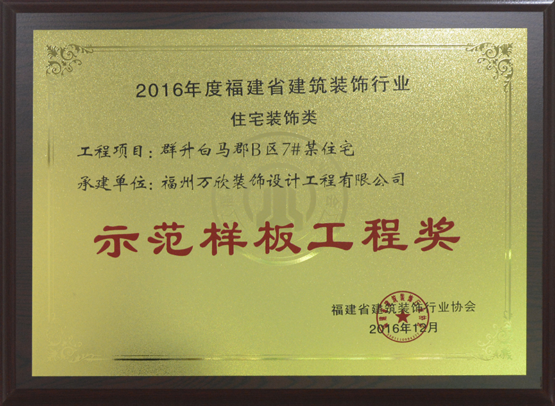 - >“群升白馬郡B區(qū)7#某住宅”榮膺2016年度福建省建筑裝飾行業(yè)示范樣板工程獎(jiǎng)