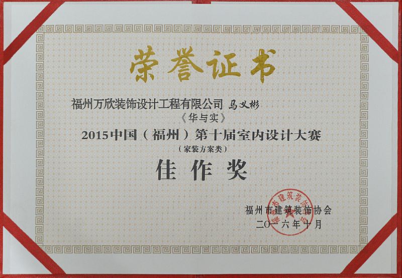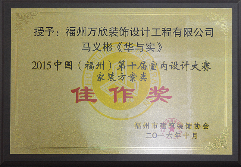 - >萬(wàn)欣裝飾作品《華與實(shí)》被評(píng)為中國(guó)(福州)第十屆室內(nèi)設(shè)計(jì)大賽(家裝方案類)佳作獎(jiǎng)