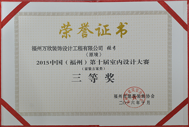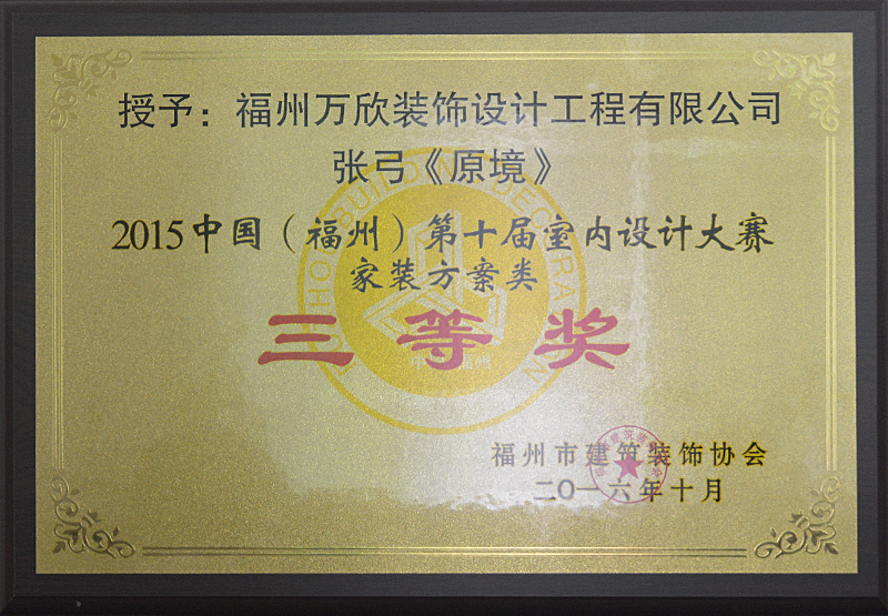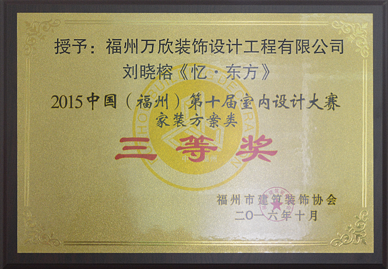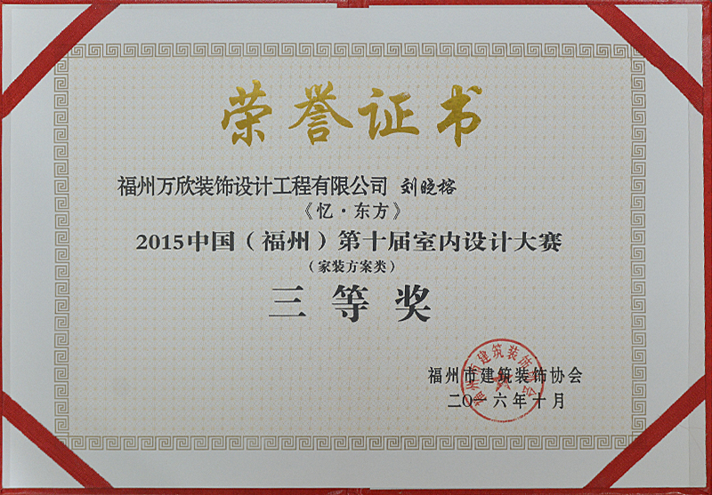 - >萬(wàn)欣裝飾作品《憶·東方》被評(píng)為中國(guó)(福州)第十屆室內(nèi)設(shè)計(jì)大賽(家裝方案類)三等獎(jiǎng)