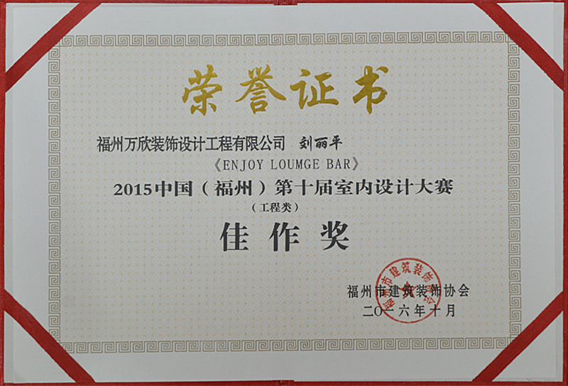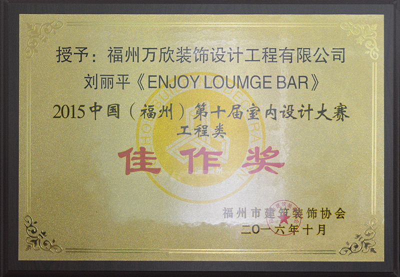 - >萬(wàn)欣裝飾作品《ENJOY LOUMGE BAR》被評(píng)為中國(guó)(福州)第十屆室內(nèi)設(shè)計(jì)大賽(工程類)佳作獎(jiǎng)