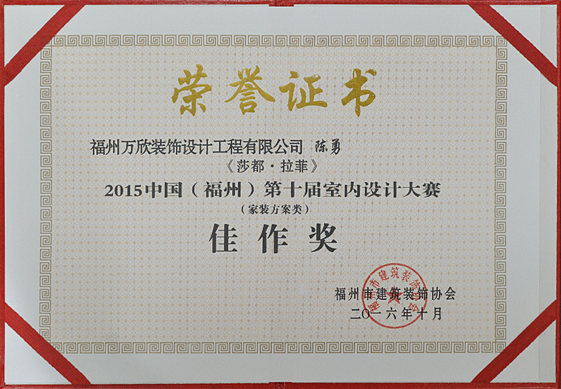 - >萬(wàn)欣裝飾作品《莎都·拉菲》被評(píng)為中國(guó)(福州)第十屆室內(nèi)設(shè)計(jì)大賽(家裝方案類)佳作獎(jiǎng)