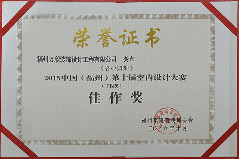 - >萬(wàn)欣裝飾作品《吾心歸處》被評(píng)為中國(guó)(福州)第十屆室內(nèi)設(shè)計(jì)大賽(工程類)佳作獎(jiǎng)
