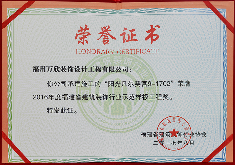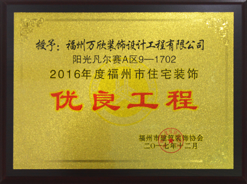 - >萬(wàn)欣裝飾“陽(yáng)光凡爾賽宮A區(qū)9#1702”被福州市裝協(xié)評(píng)選為優(yōu)良工程