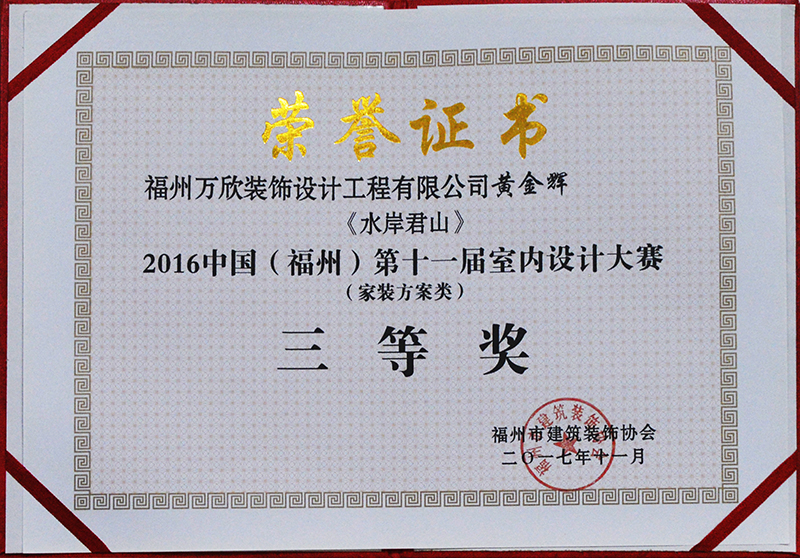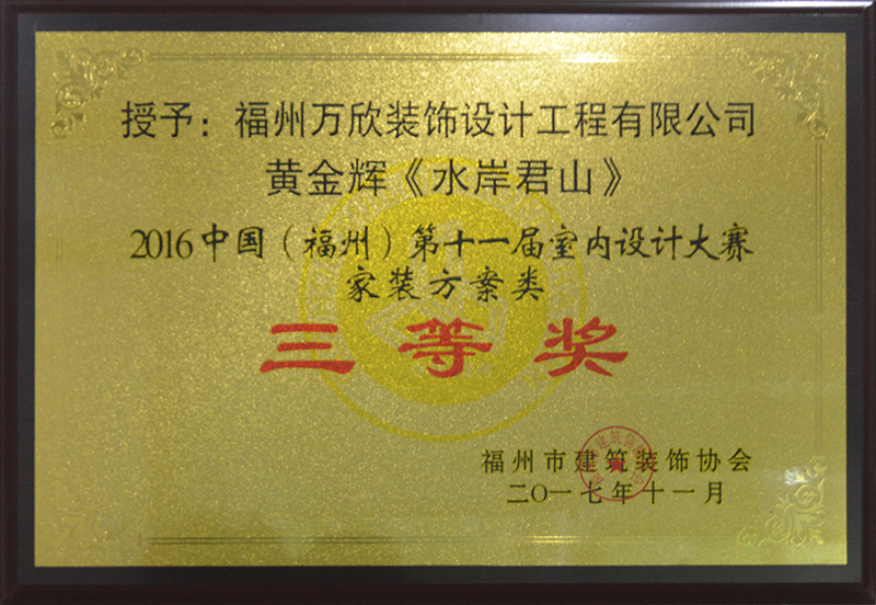 - >萬(wàn)欣裝飾作品《水岸君山》榮獲中國(guó)(福州)第十一屆室內(nèi)設(shè)計(jì)大賽家裝方案類三等獎(jiǎng)