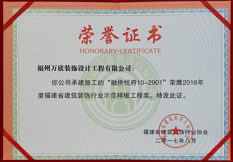 - >萬(wàn)欣裝飾“融僑悅府10#2901”被福建省裝協(xié)評(píng)為示范樣板工程獎(jiǎng)