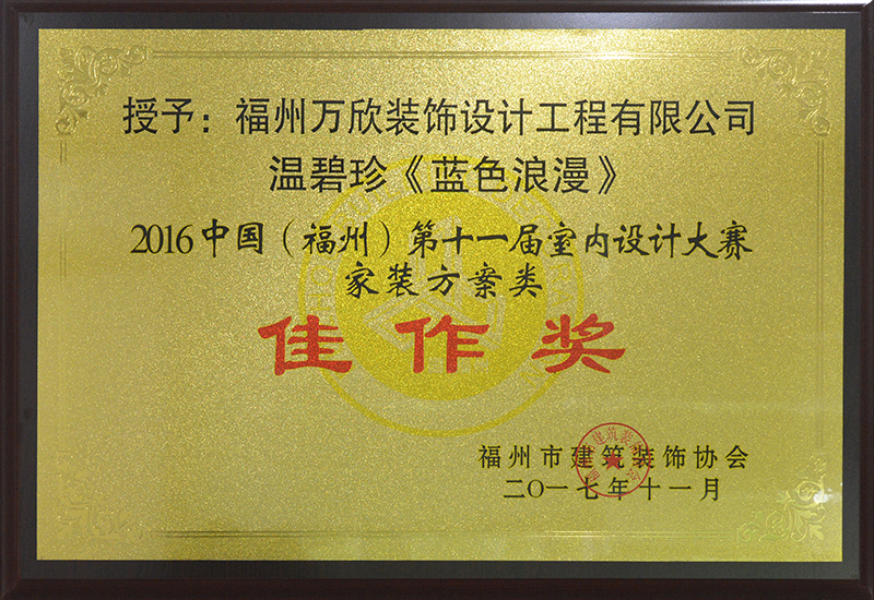 - >萬(wàn)欣裝飾作品《藍(lán)色浪漫》榮獲中國(guó)(福州)第十一屆室內(nèi)設(shè)計(jì)大賽家裝方案類佳作獎(jiǎng)