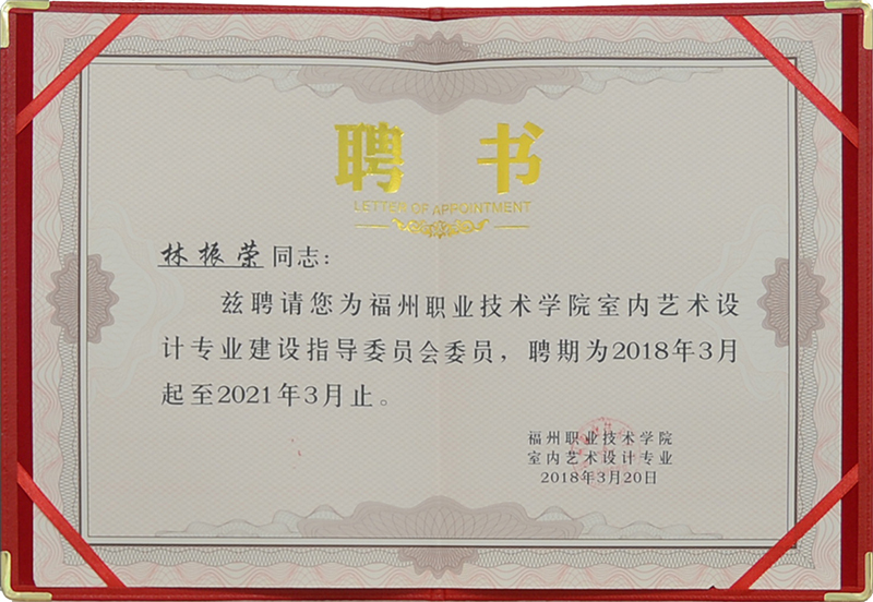 - >聘請(qǐng)林振榮為福州職業(yè)技術(shù)學(xué)院室內(nèi)藝術(shù)設(shè)計(jì)專業(yè)委員會(huì)委員
