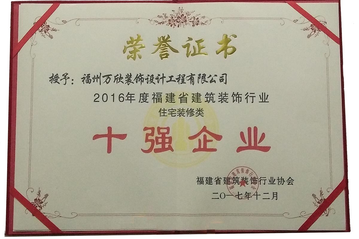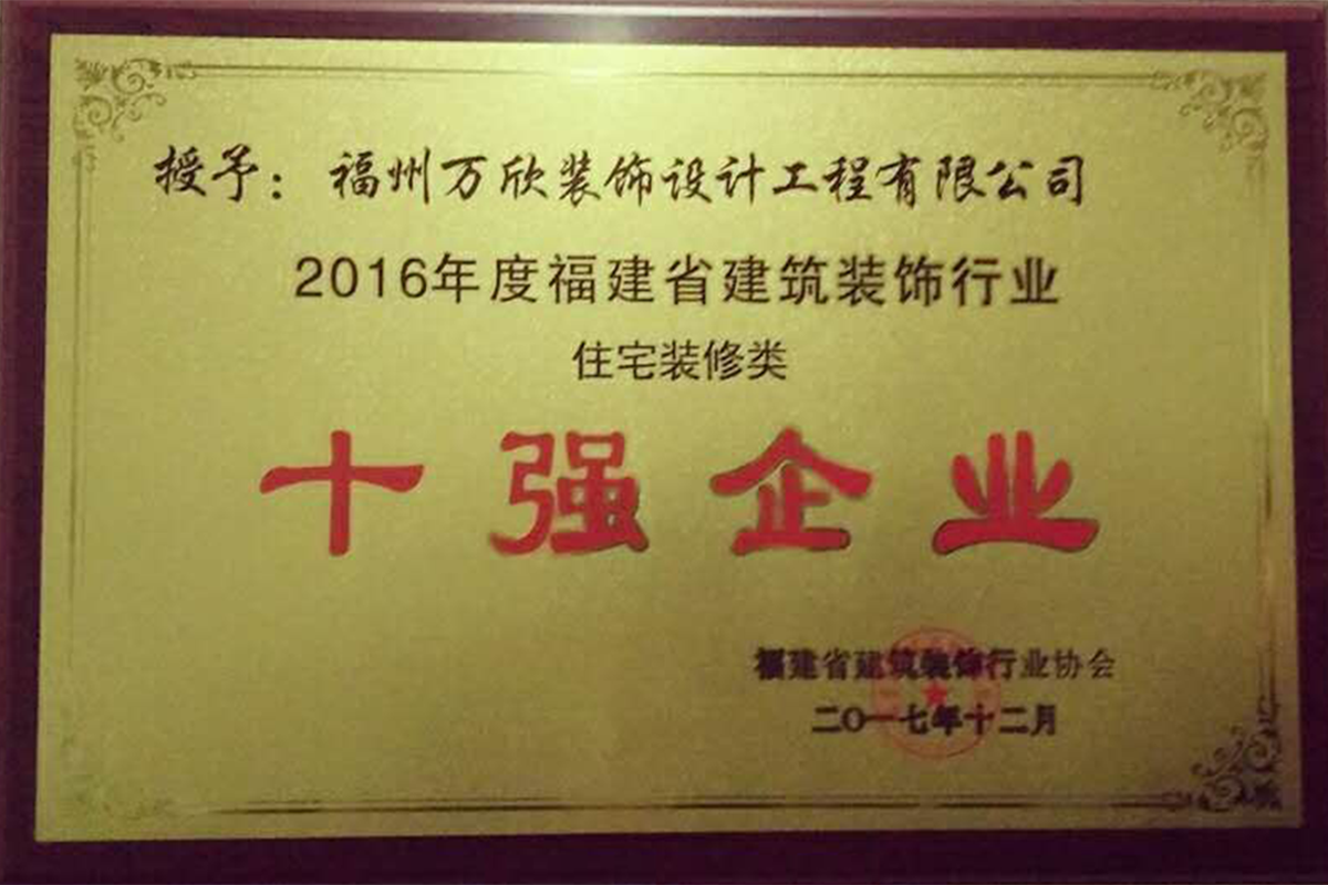- >萬(wàn)欣裝飾榮獲2016年度福建省建筑裝飾行業(yè)住宅類裝修十強(qiáng)企業(yè)
