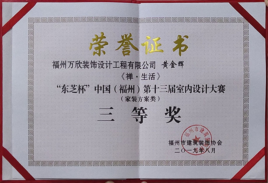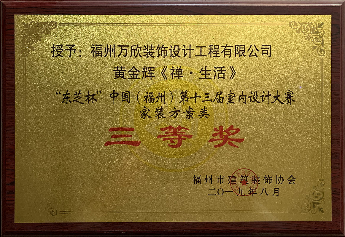 - >萬(wàn)欣裝飾作品《禪 · 生活》被評(píng)為中國(guó)(福州)第十三屆室內(nèi)設(shè)計(jì)大賽(家裝方案類)三等獎(jiǎng)