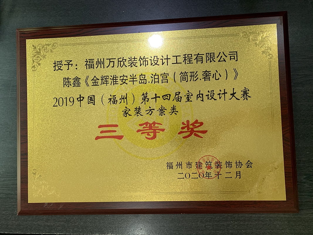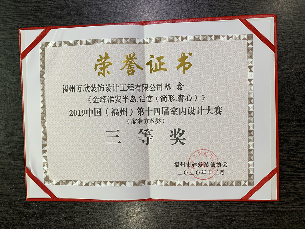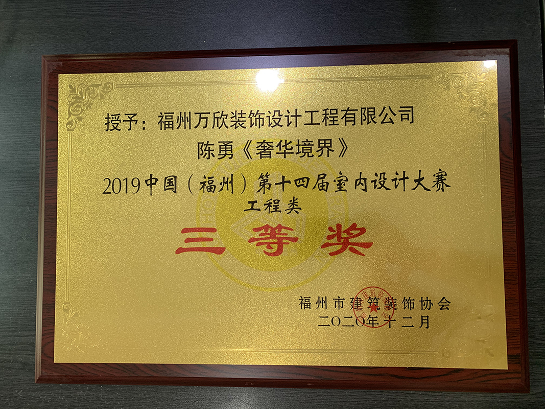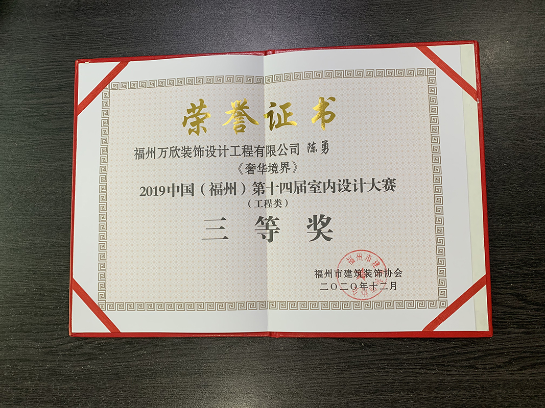 - >萬(wàn)欣裝飾作品《奢華境界》被評(píng)為中國(guó)(福州)第十四屆室內(nèi)設(shè)計(jì)大賽(工程類)三等獎(jiǎng)