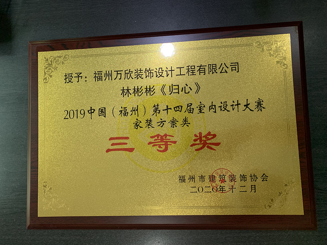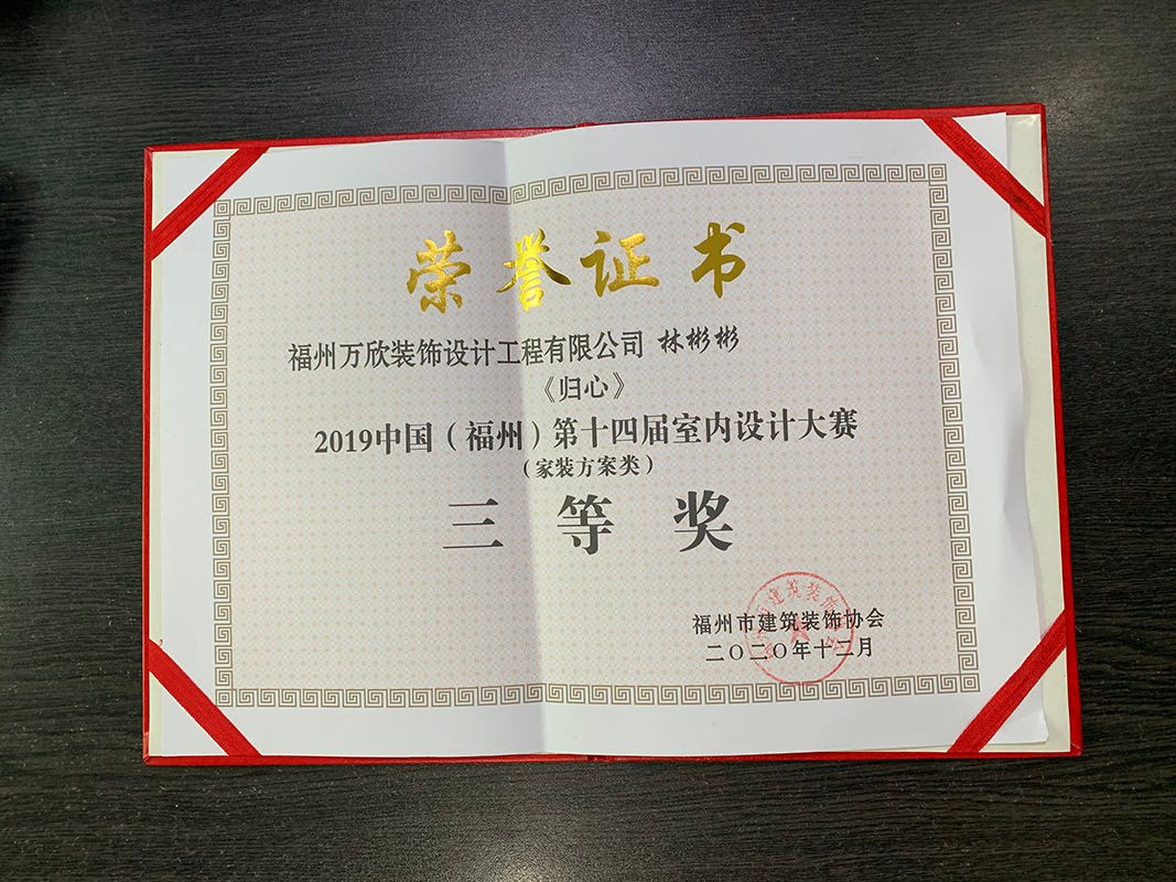 - >萬(wàn)欣裝飾作品《歸心》被評(píng)為中國(guó)(福州)第十四屆室內(nèi)設(shè)計(jì)大賽(家裝方案類)三等獎(jiǎng)