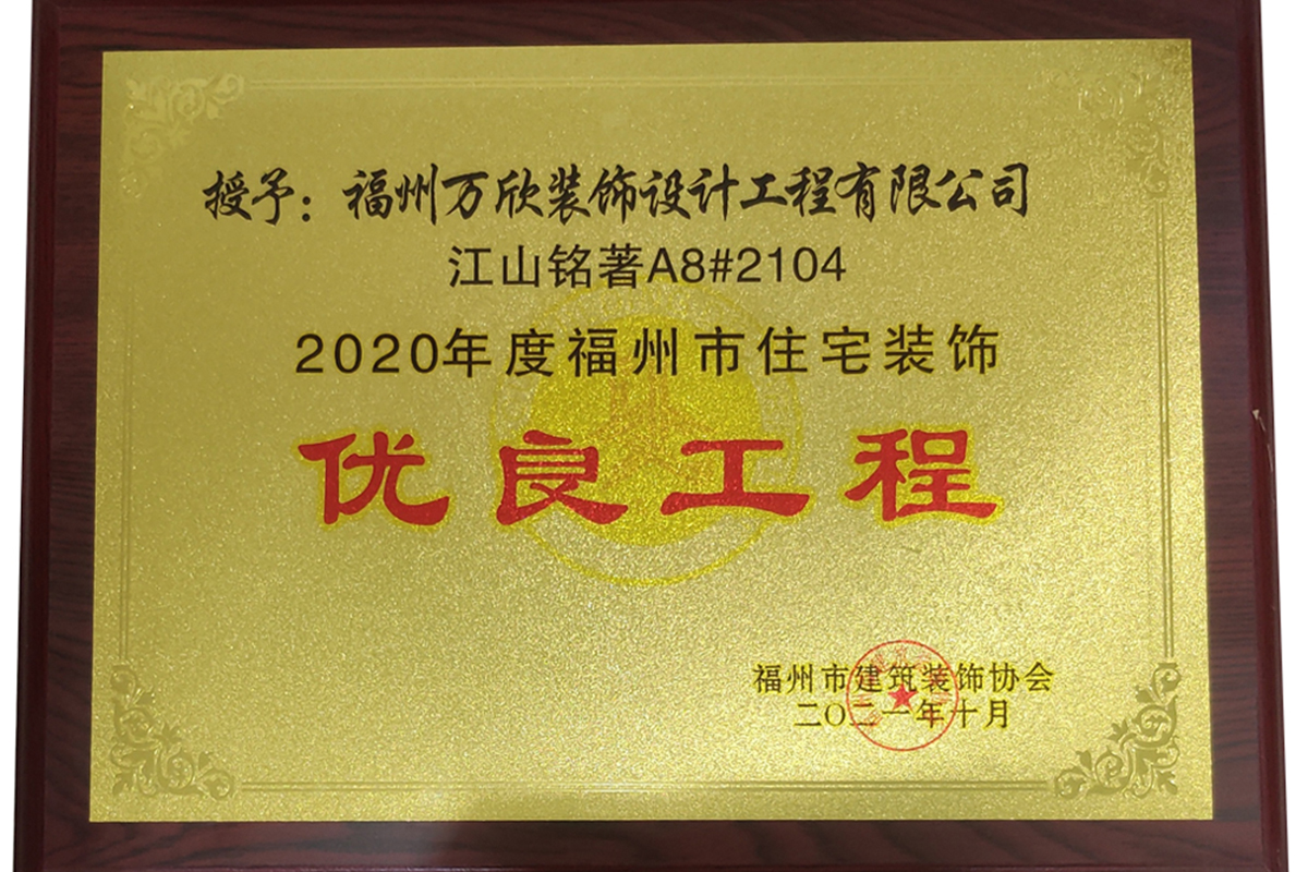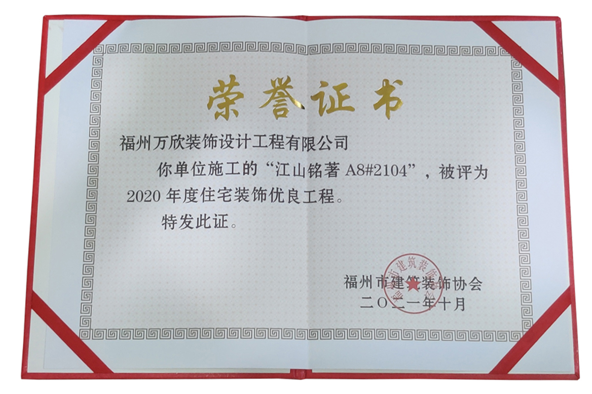 - >萬(wàn)欣裝飾“江山銘著A8#2104”被福州市裝協(xié)評(píng)選為優(yōu)良工程