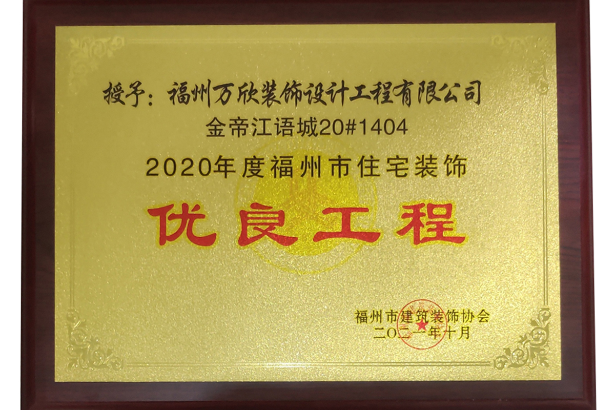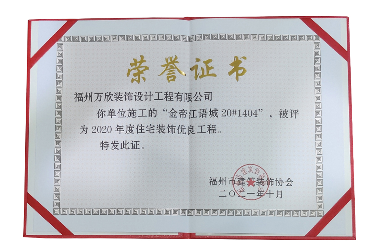 - >萬(wàn)欣裝飾“金帝江語(yǔ)城20#1404”被福州市裝協(xié)評(píng)選為優(yōu)良工程