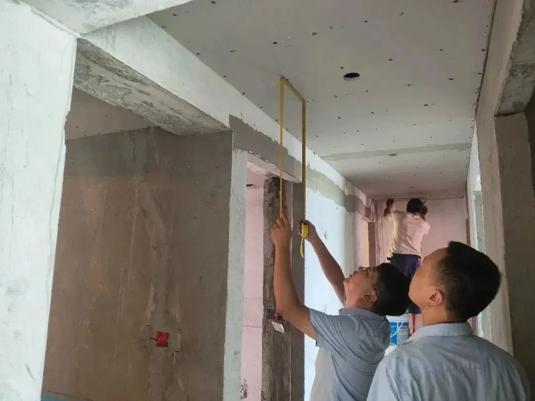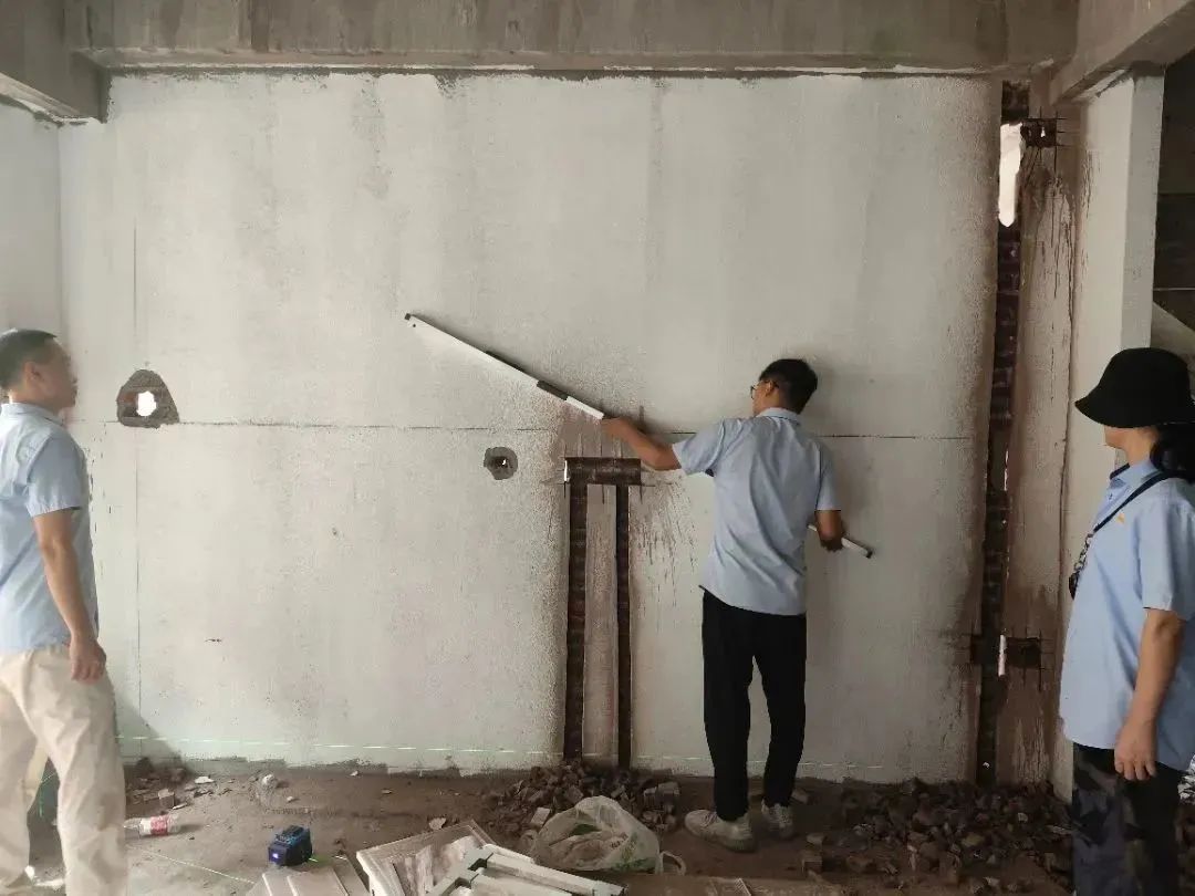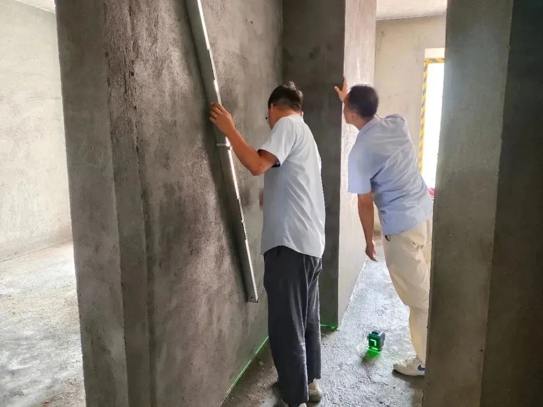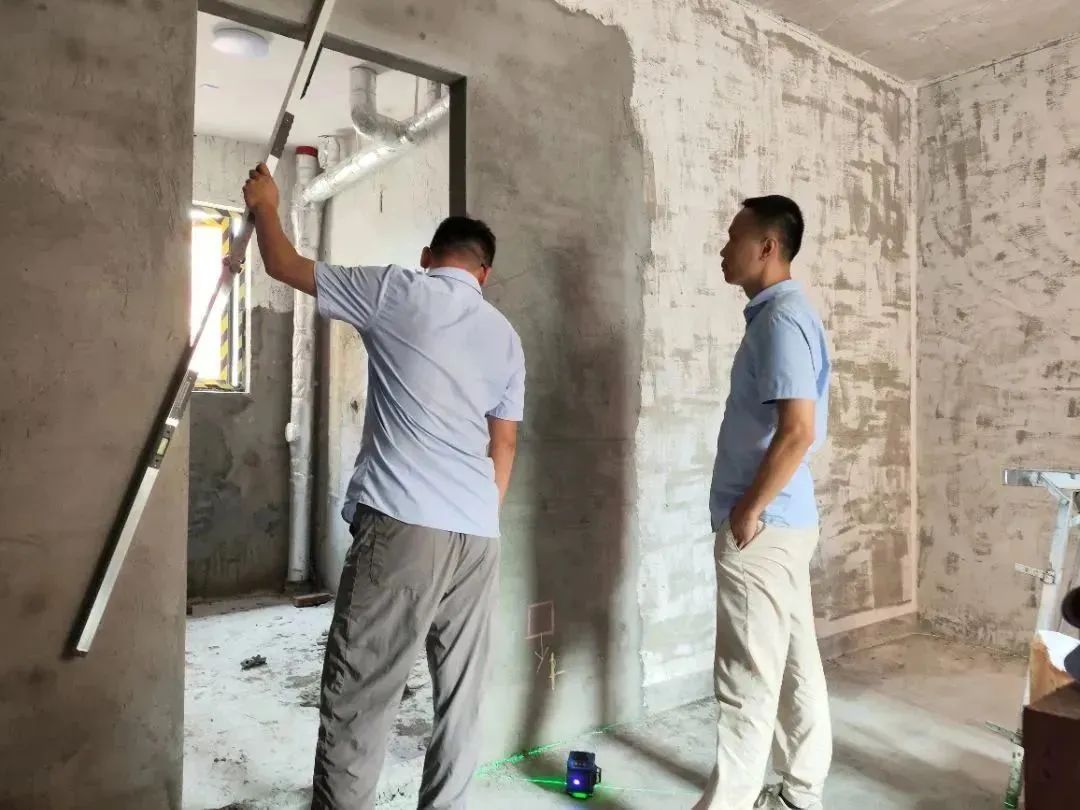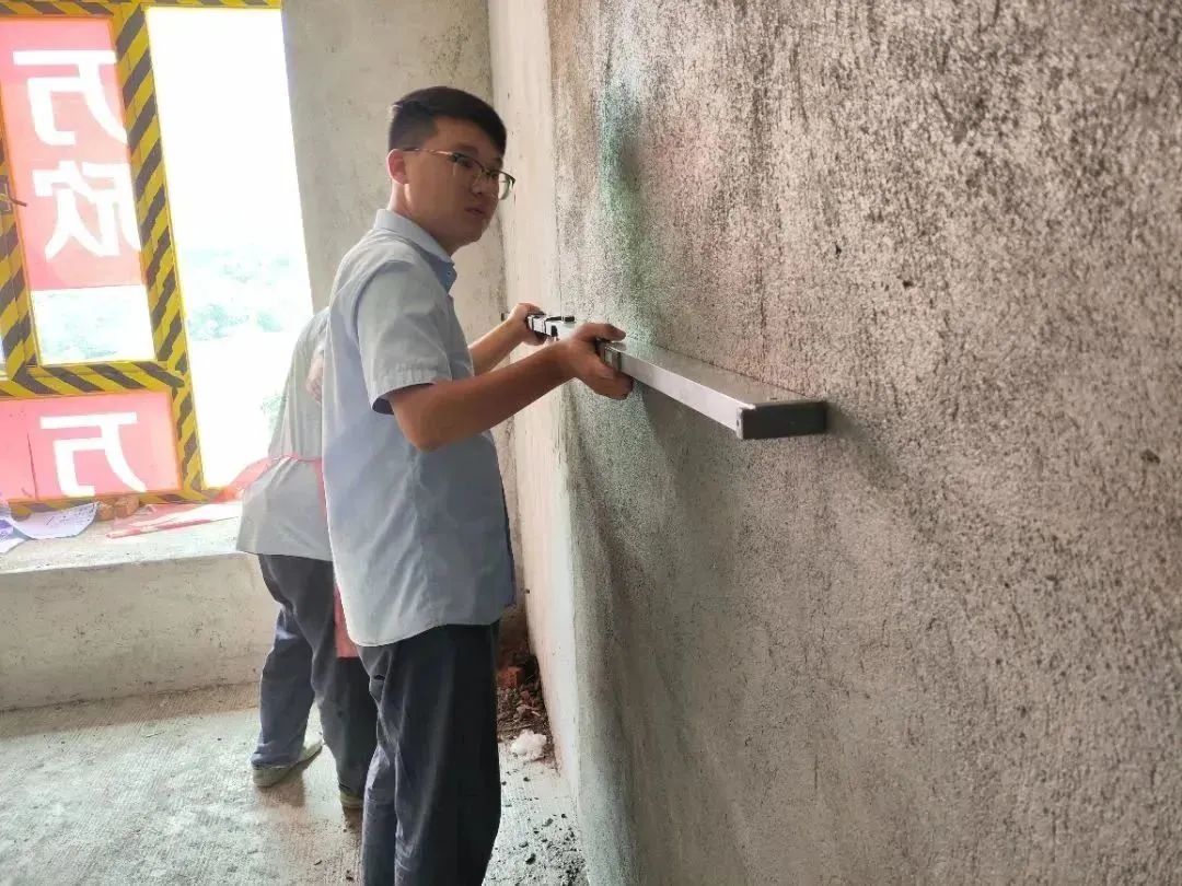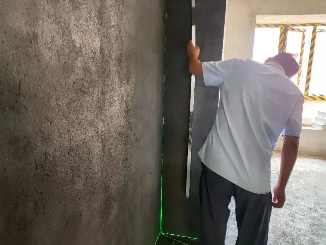 △ 現(xiàn)場用2米長的靠尺,檢查粉刷后墻面平整與地面是否平整,防止出現(xiàn)空響等問題,影響工程質(zhì)量和進度。