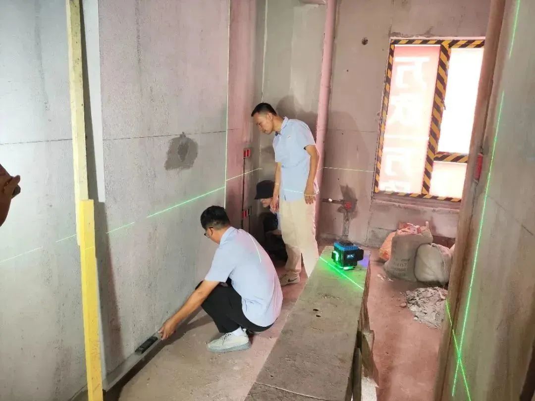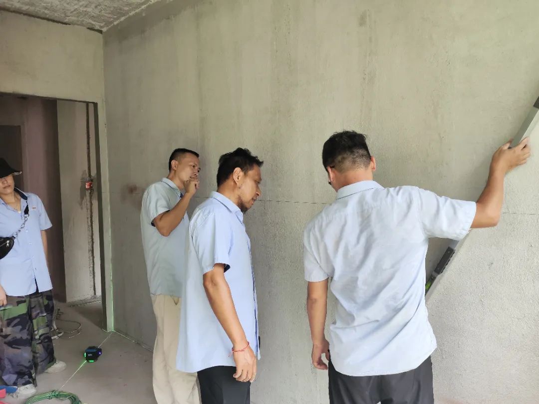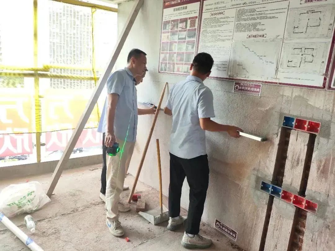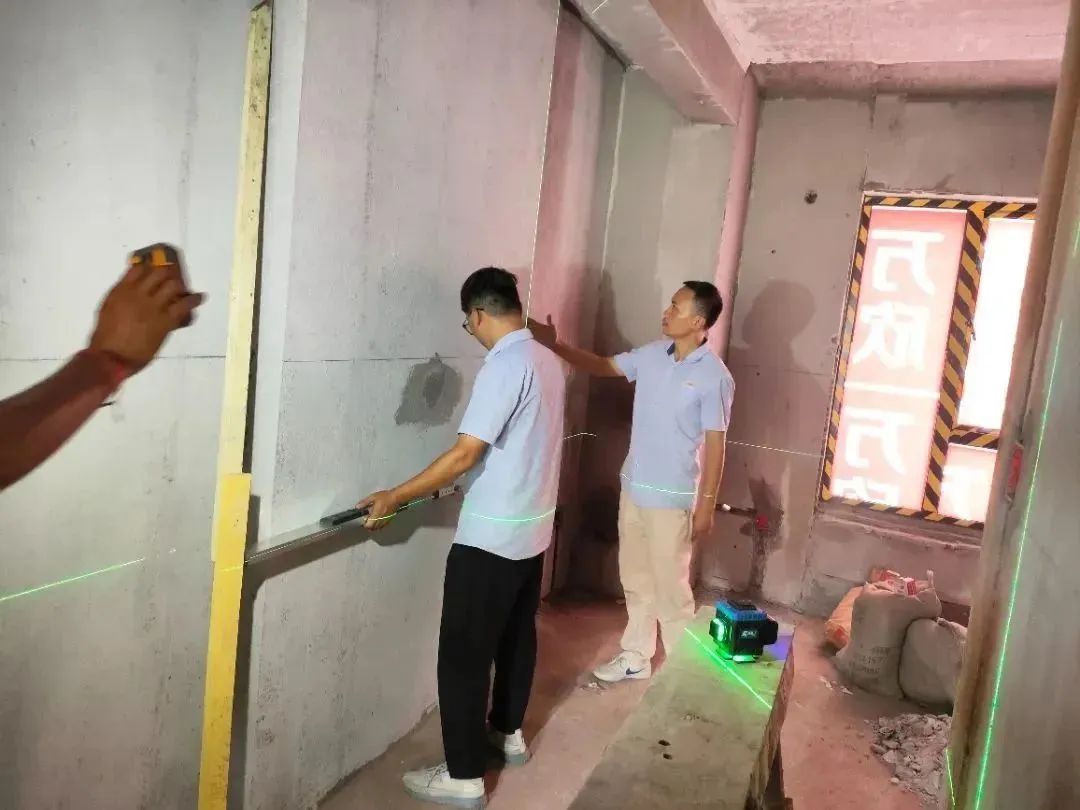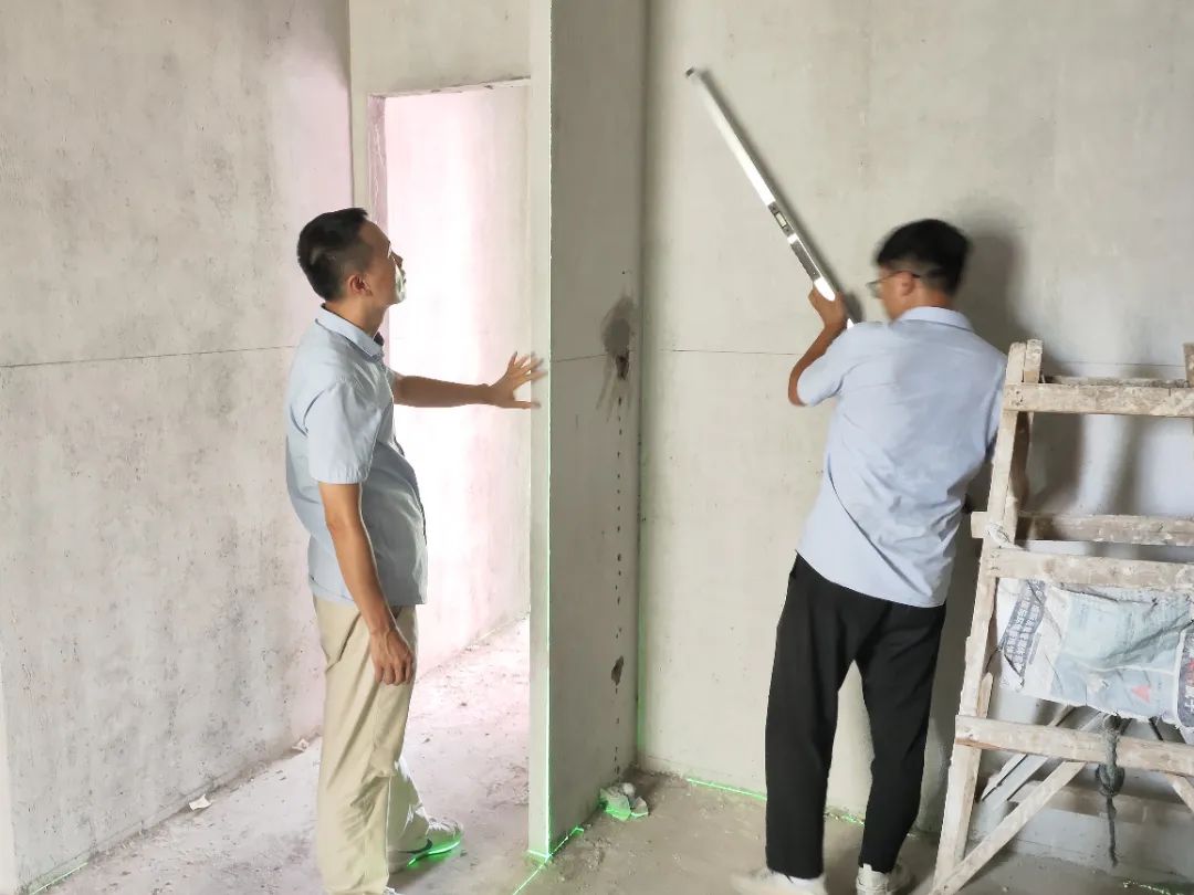 △ 現(xiàn)場用2米長的靠尺,檢查粉刷后墻面平整與地面是否平整,防止出現(xiàn)空響等問題,影響工程質(zhì)量和進度。