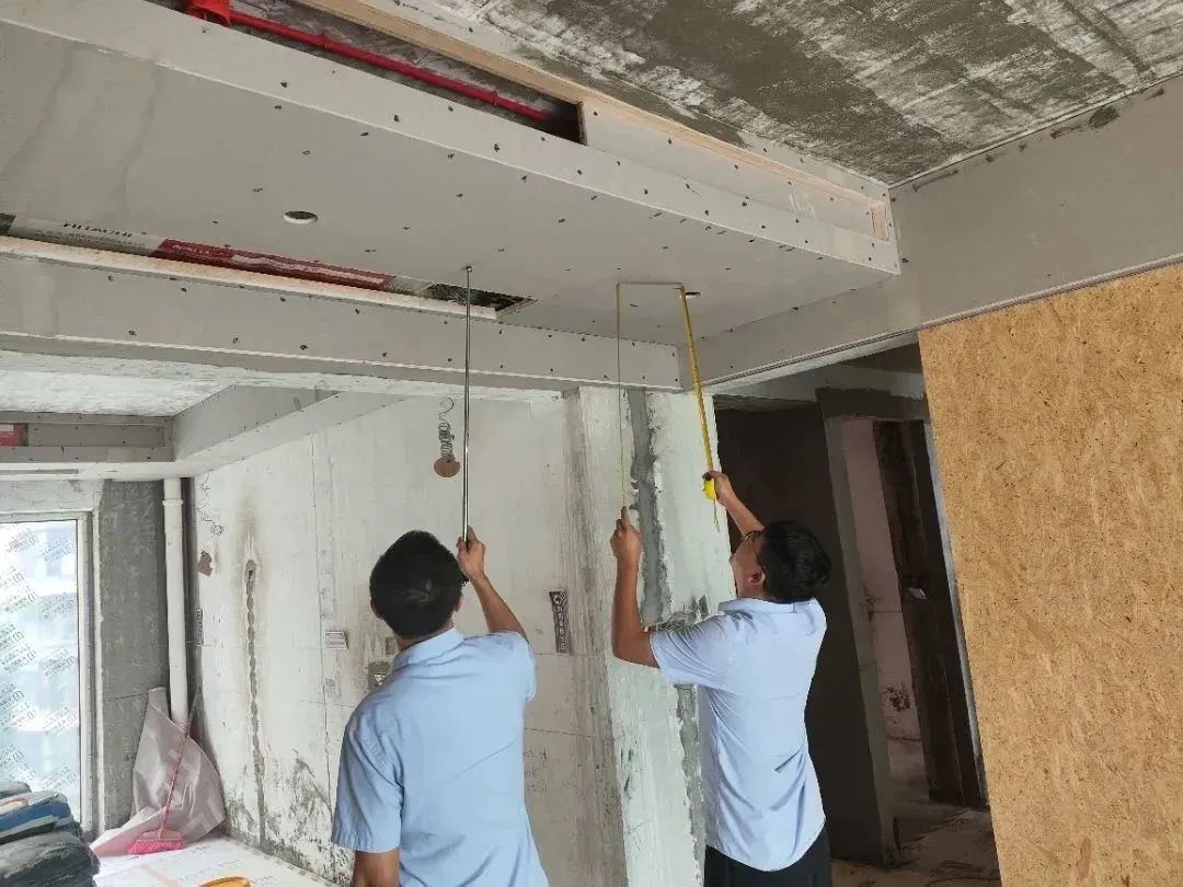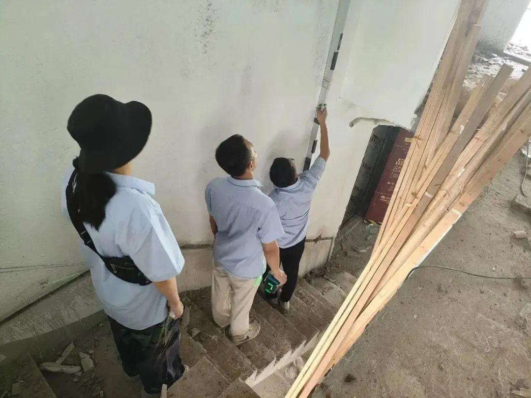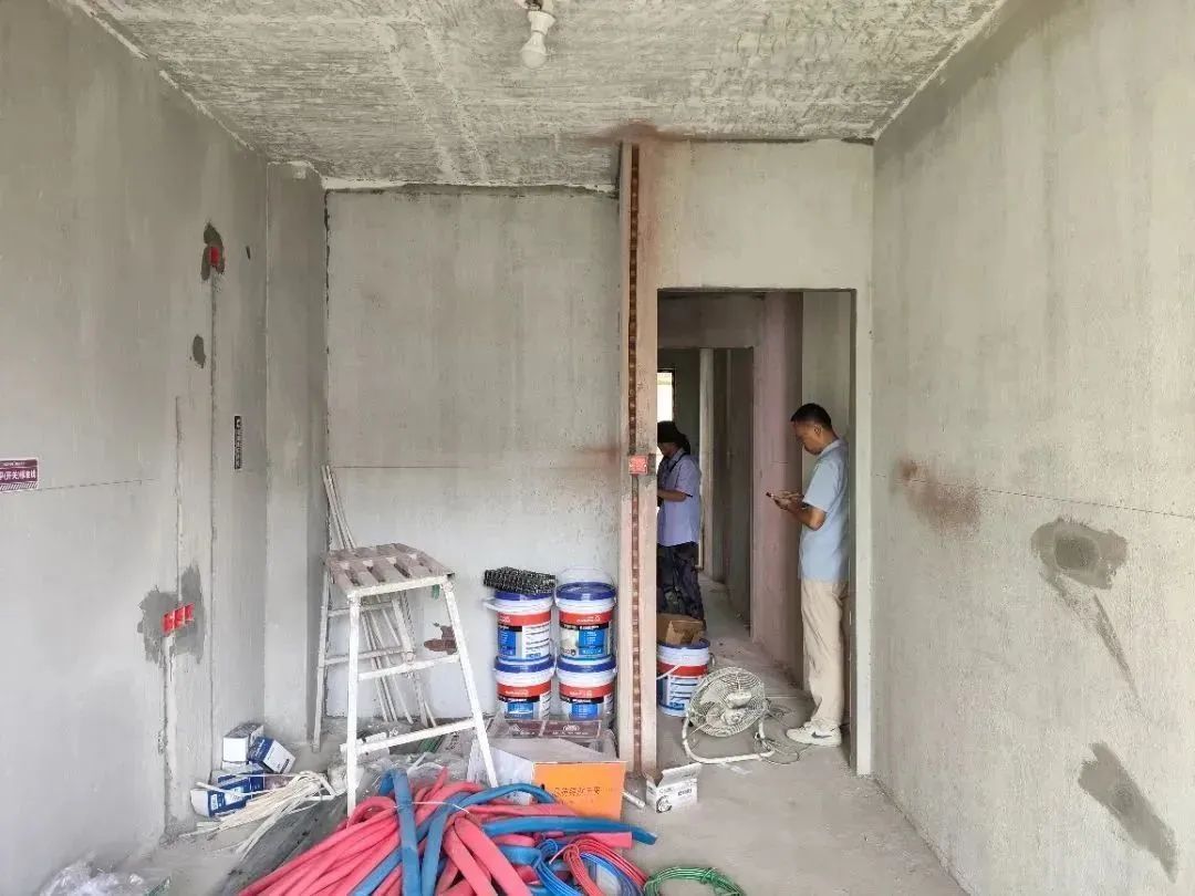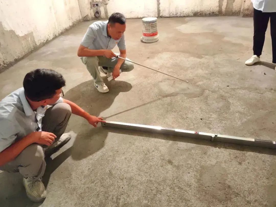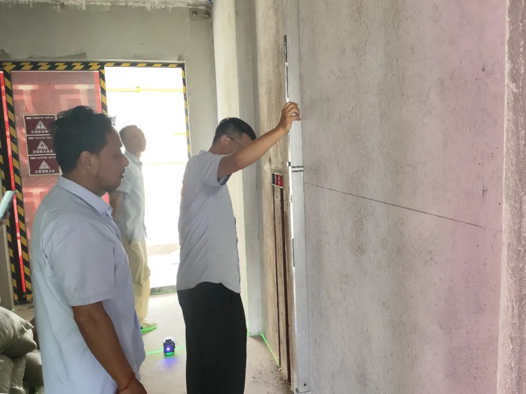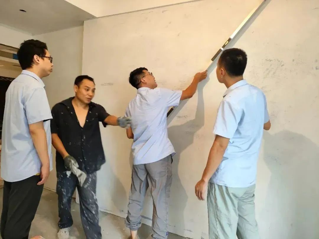 △ 現(xiàn)場用2米長的靠尺,檢查粉刷后墻面平整與地面是否平整,防止出現(xiàn)空響等問題,影響工程質(zhì)量和進度。