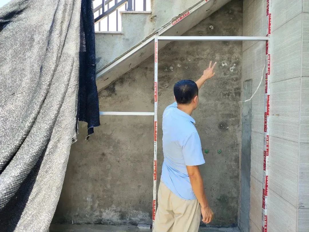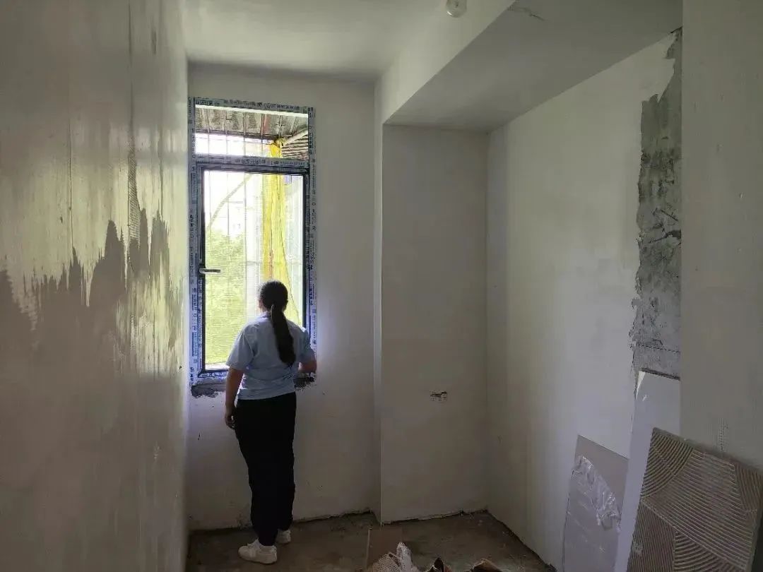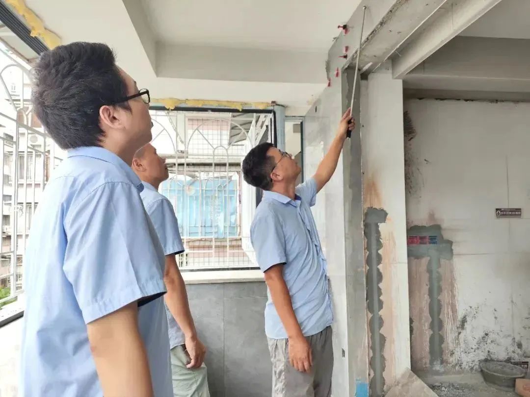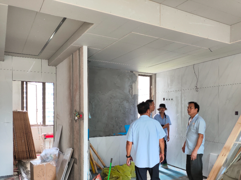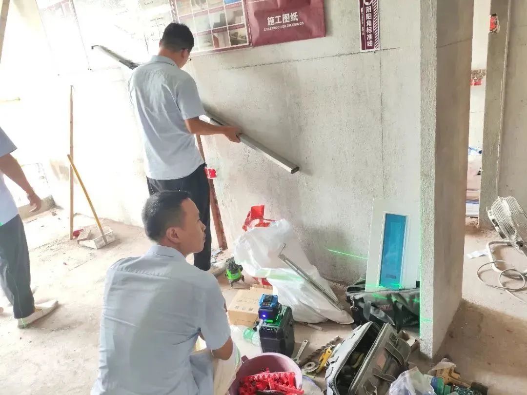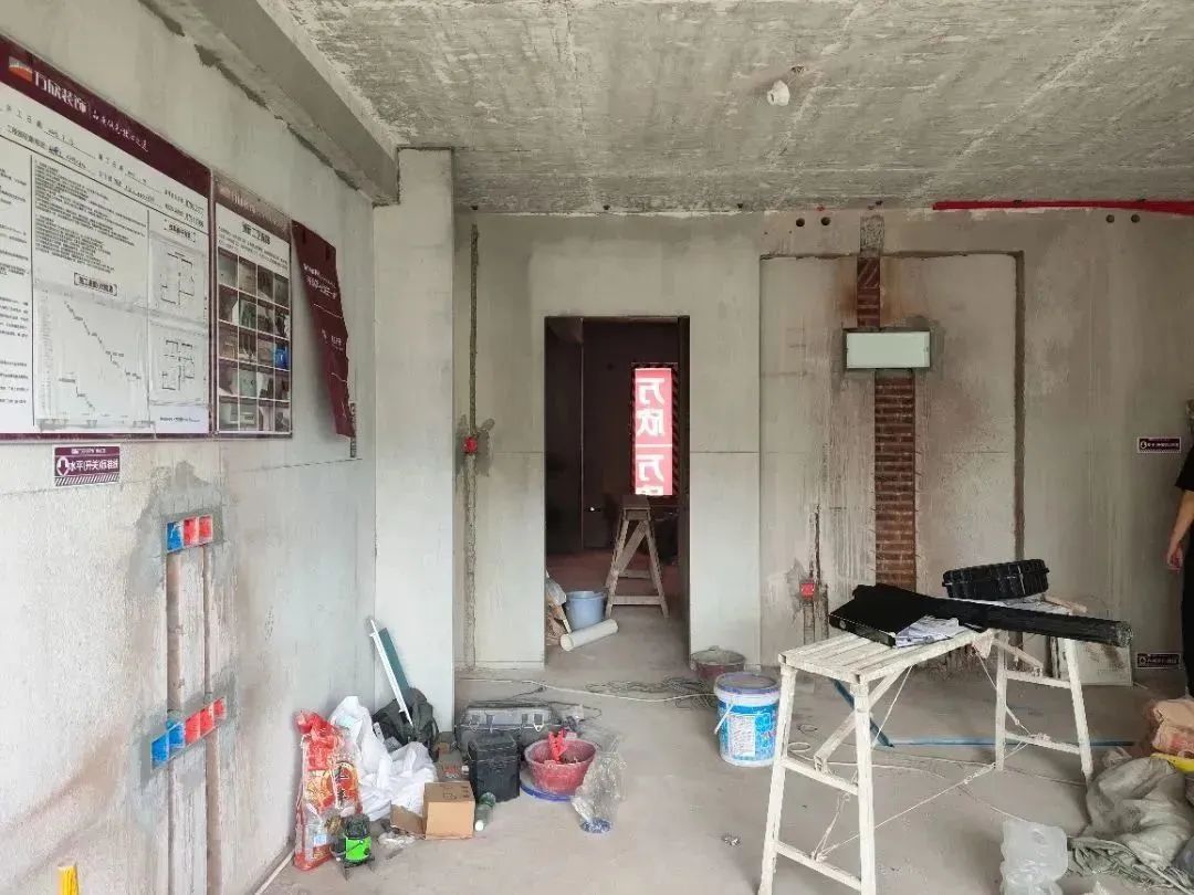△ 現(xiàn)場用2米長的靠尺,檢查粉刷后墻面平整與地面是否平整,防止出現(xiàn)空響等問題,影響工程質(zhì)量和進度。