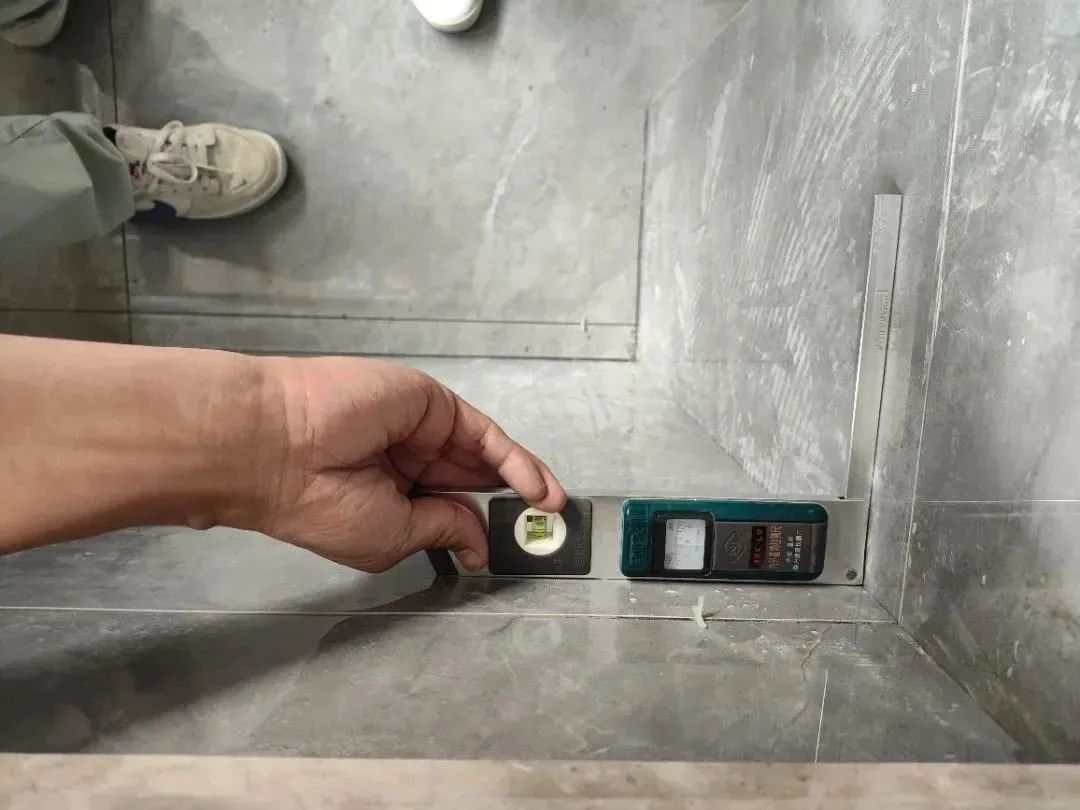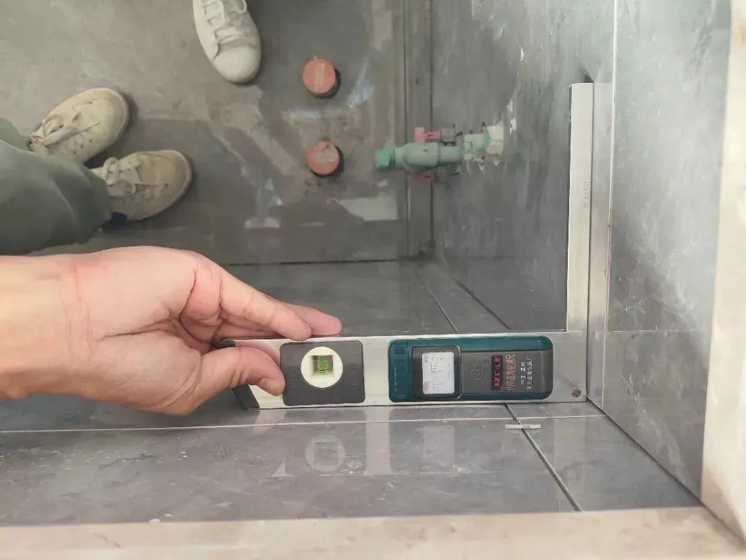 △檢查瓷磚陰角的垂直度,瓷磚陰角的垂直度關(guān)系到后續(xù)柜子和家具安裝與墻體縫隙的大小