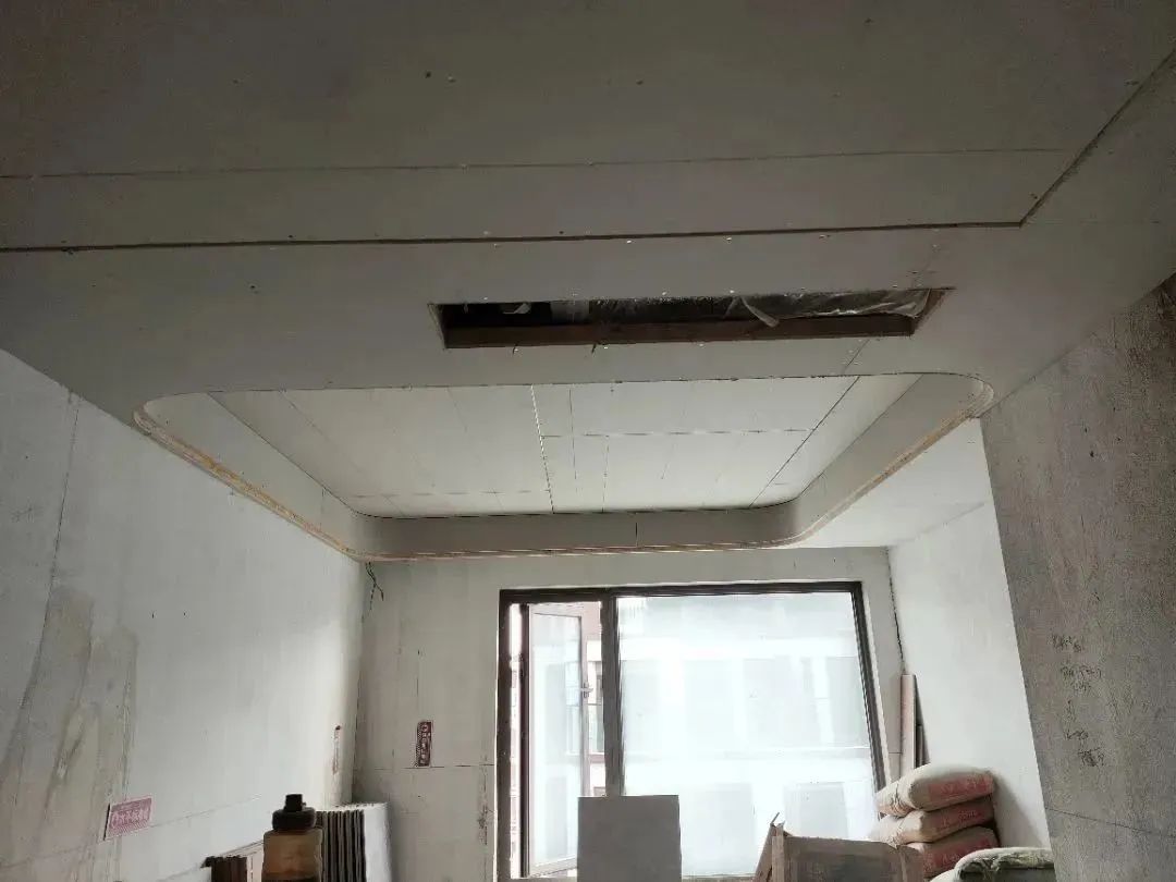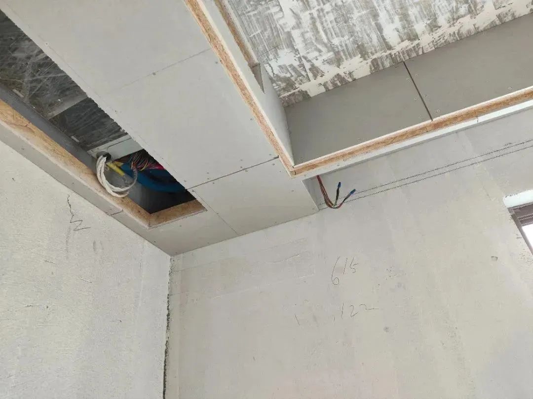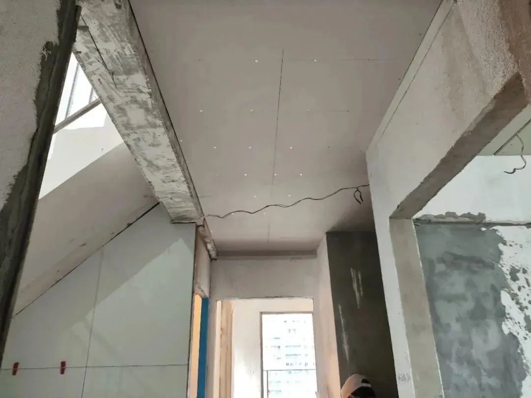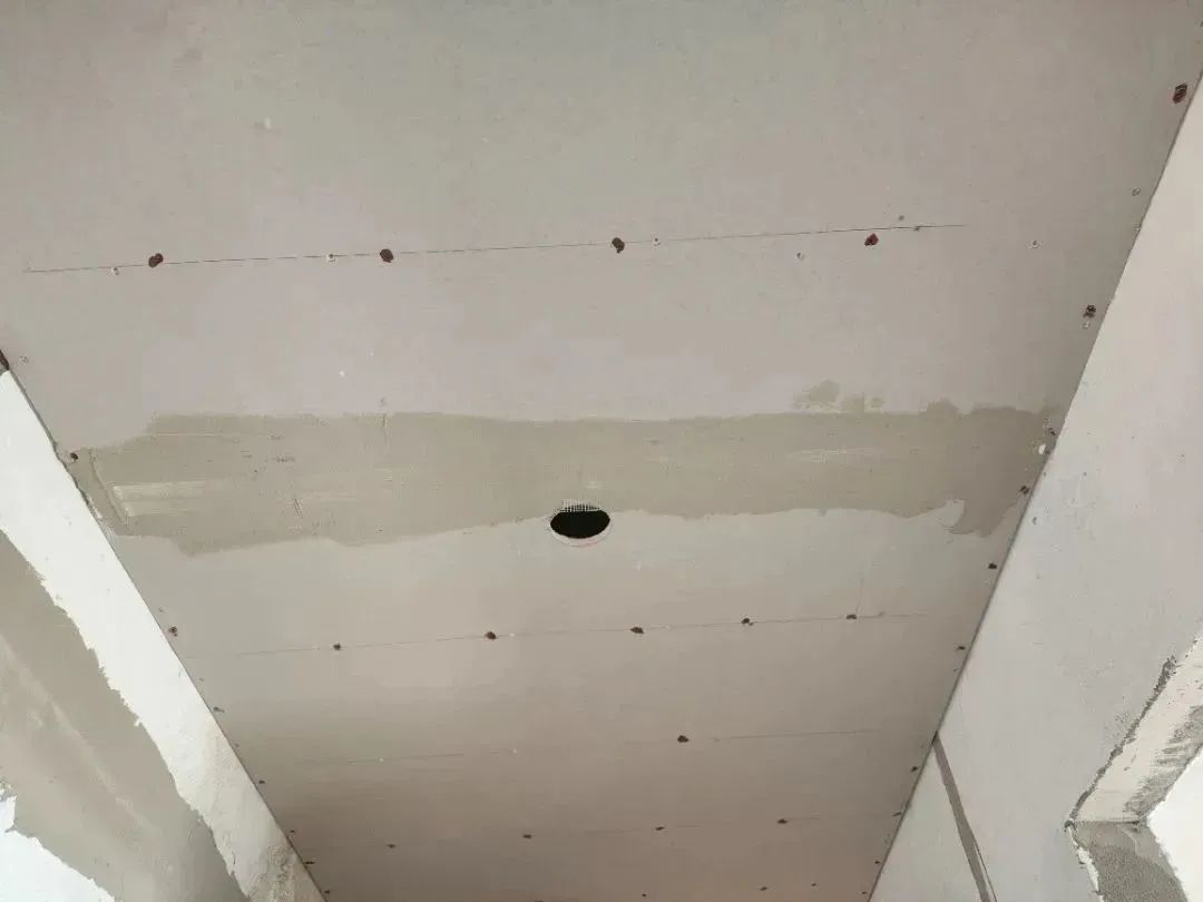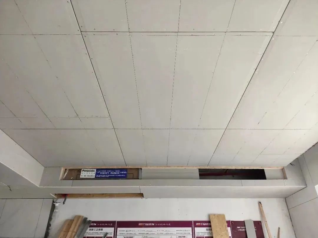 △吊頂施工工藝,吊頂釘螺絲處用防銹漆防銹處理,并在接縫處貼麻布做防裂處理。