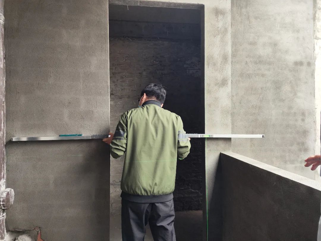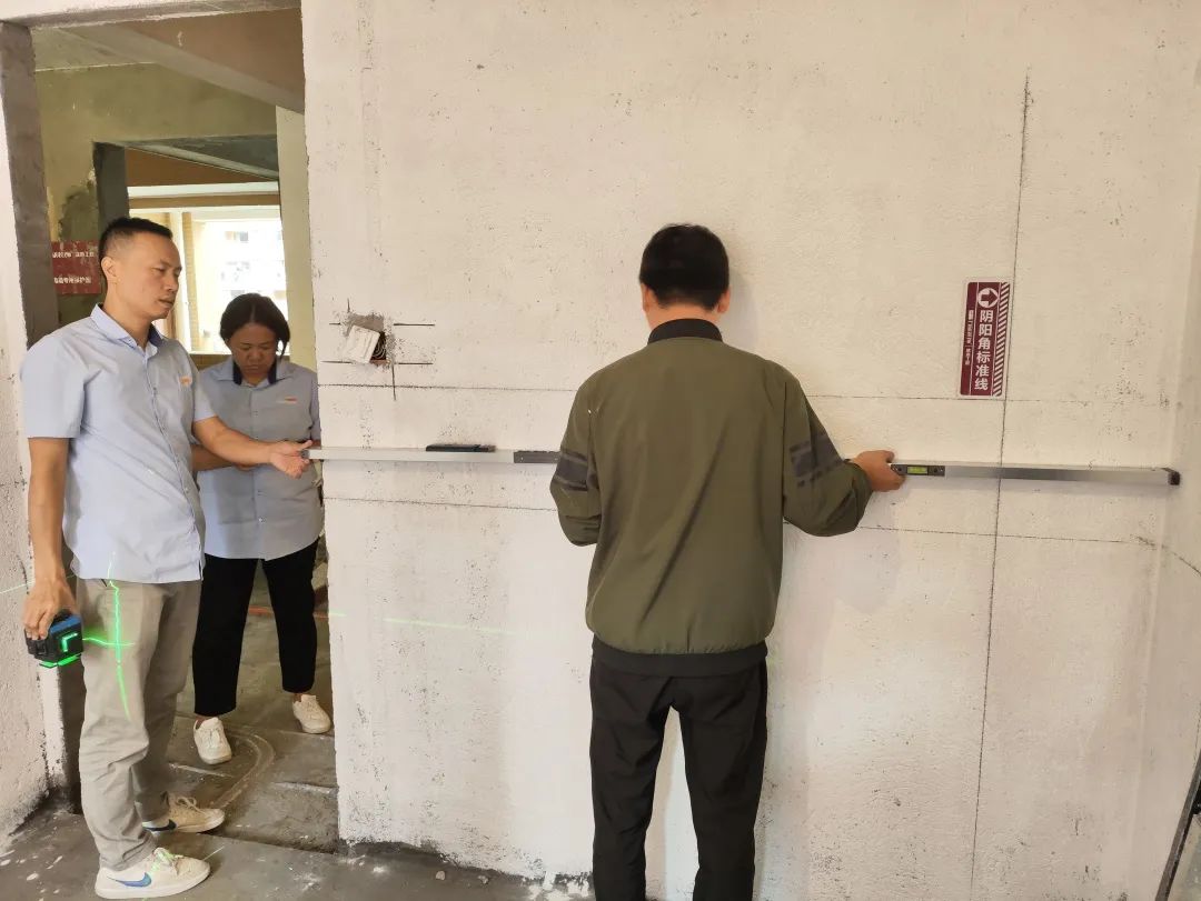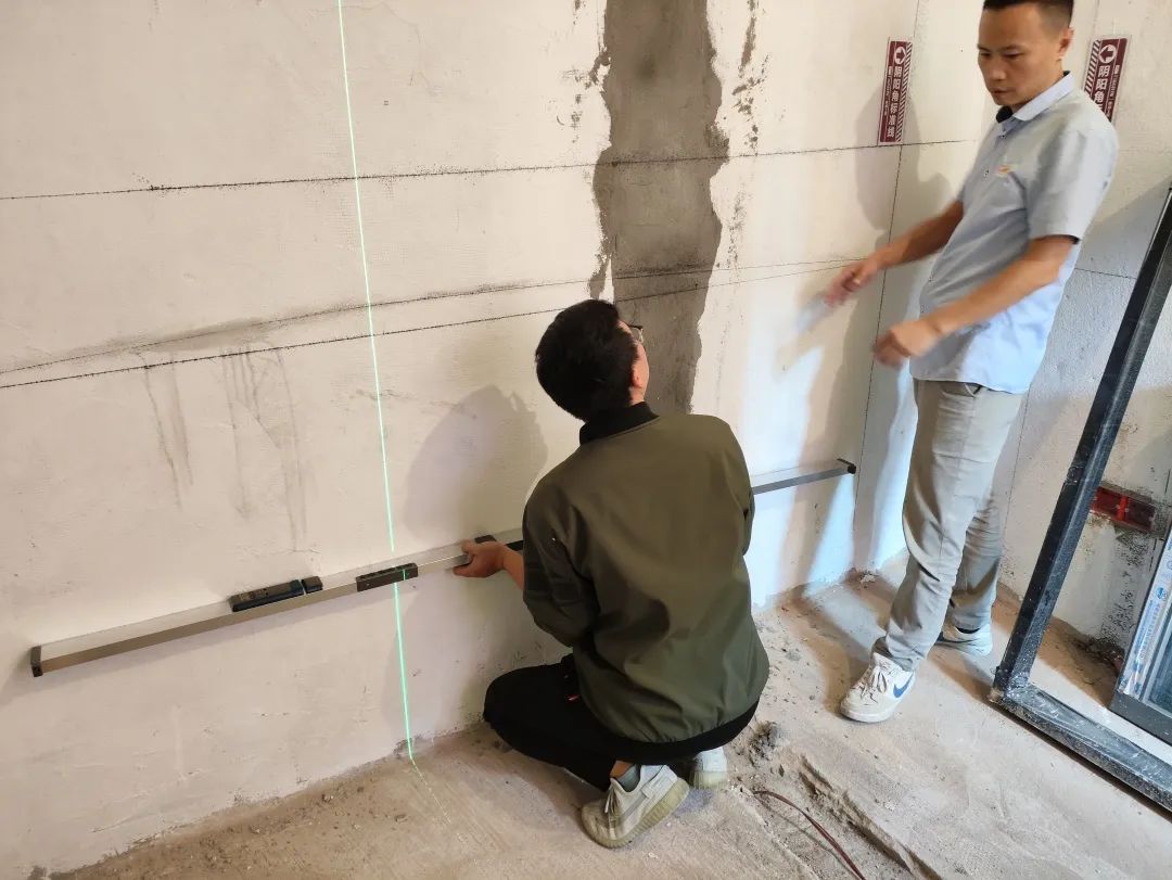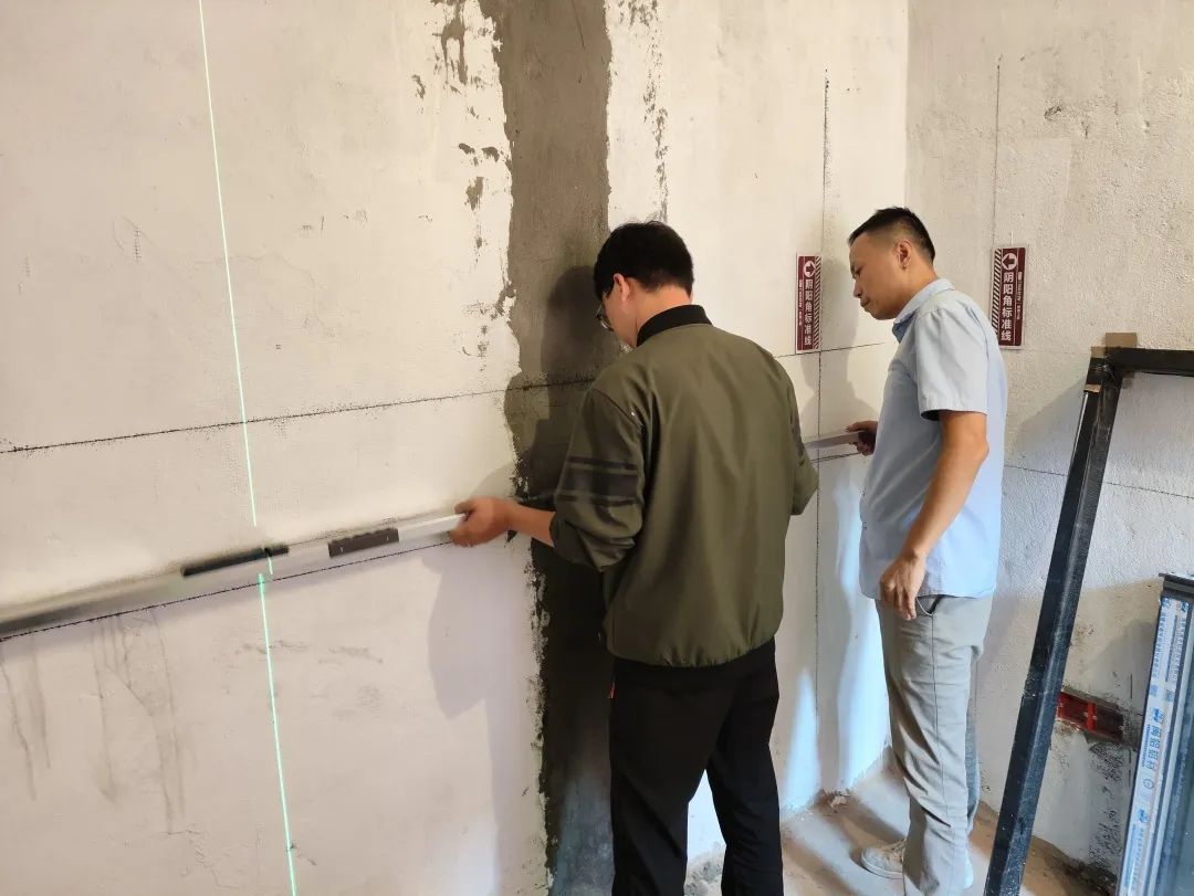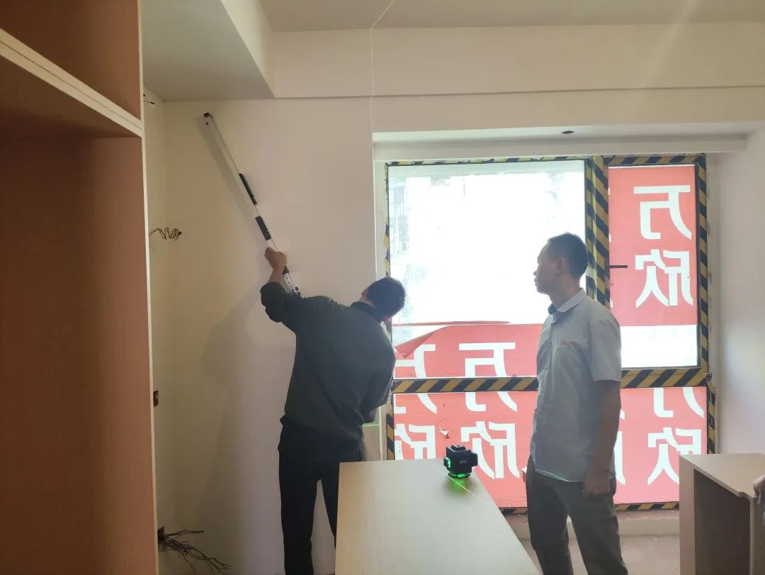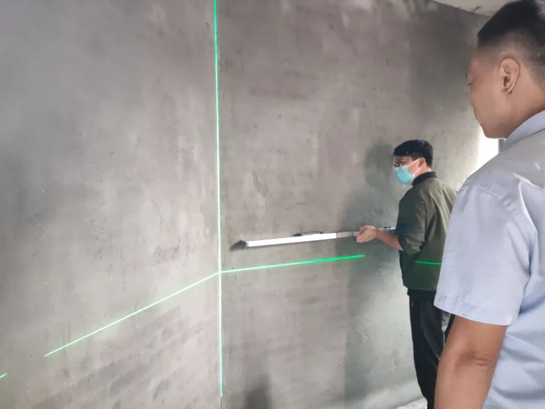 △現(xiàn)場(chǎng)用兩米靠尺和激光水平儀測(cè)量墻體的平整度和垂直度。