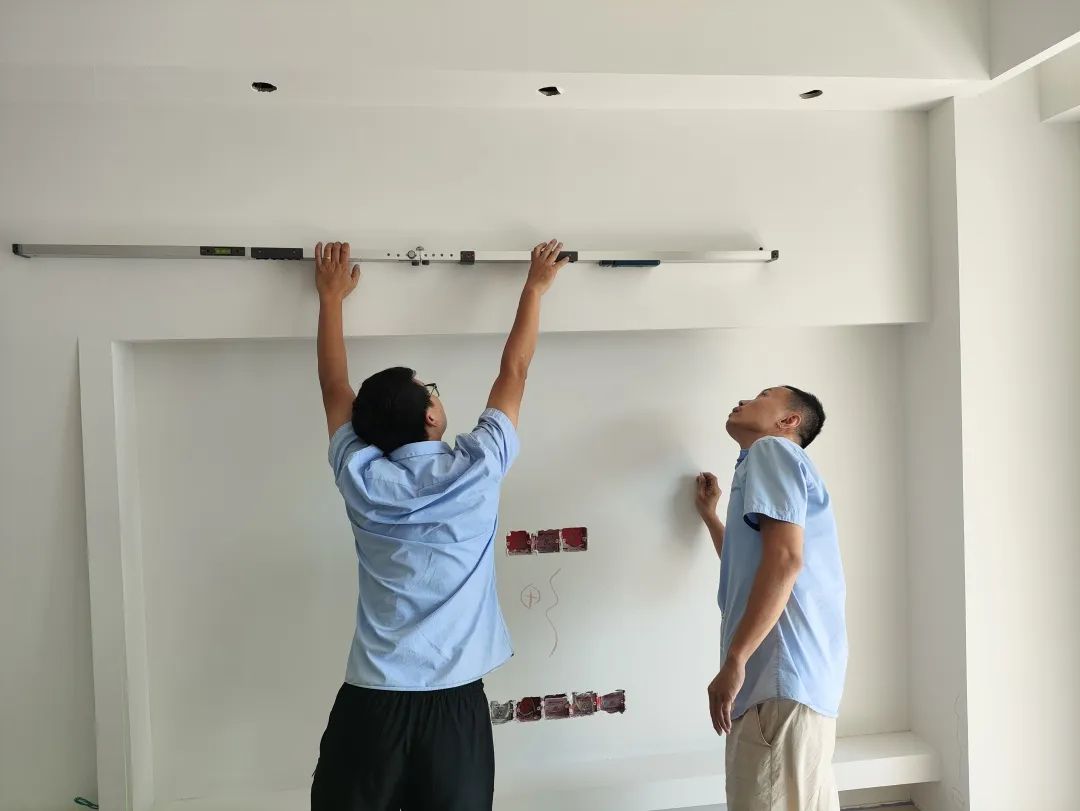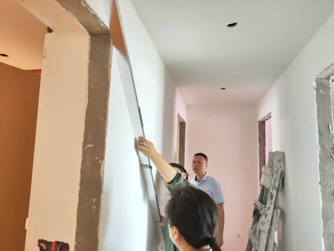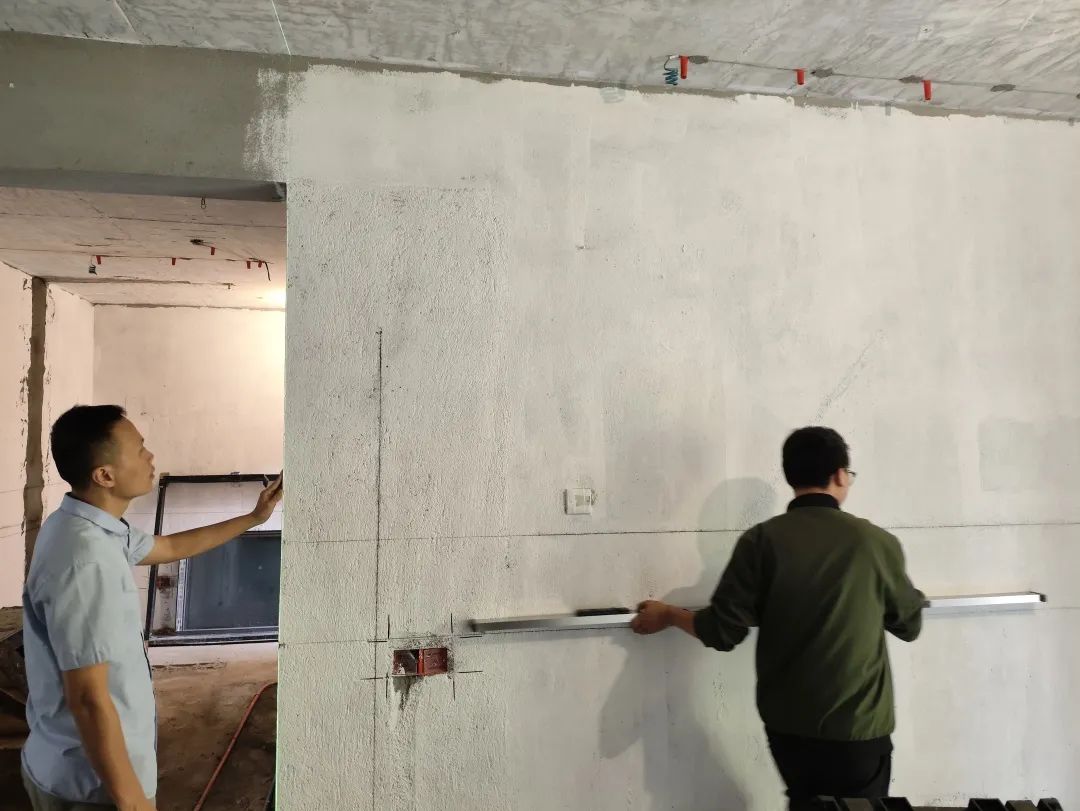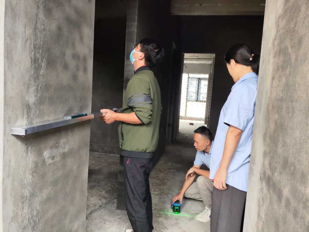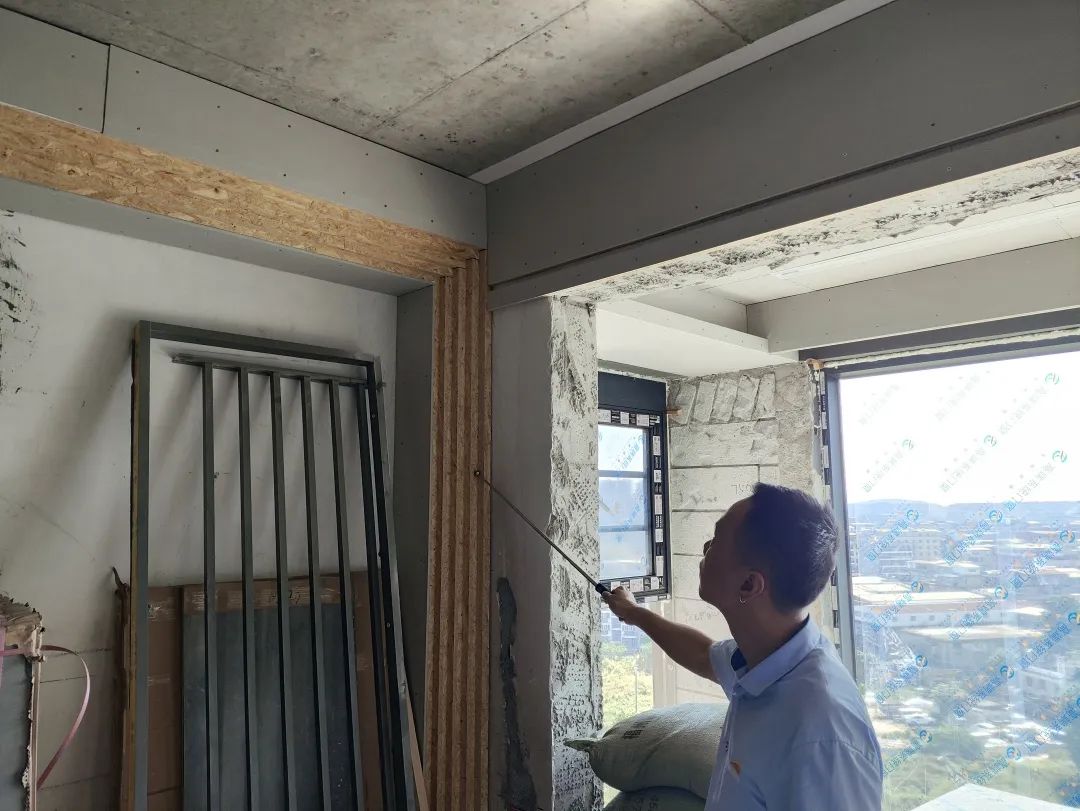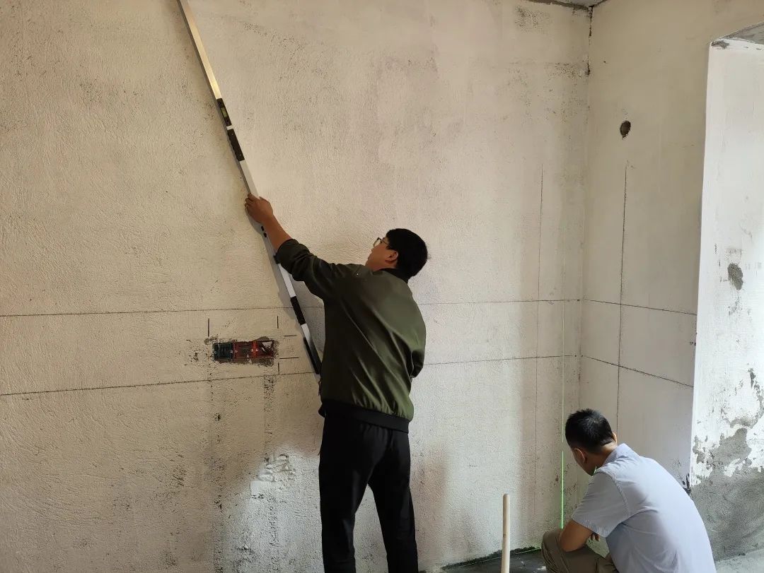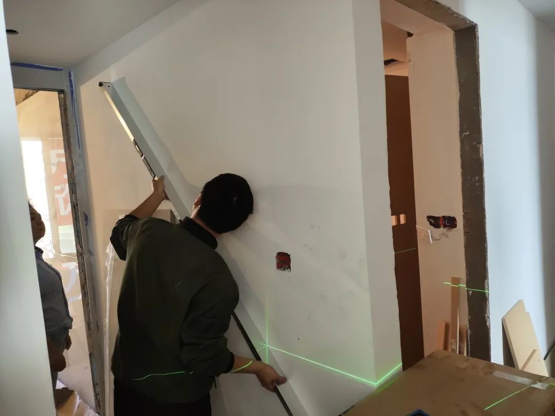 △現(xiàn)場(chǎng)用兩米靠尺和激光水平儀測(cè)量墻體的平整度和垂直度。