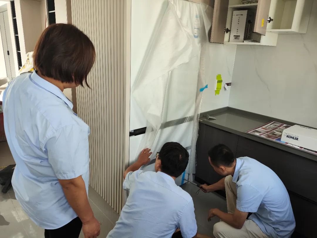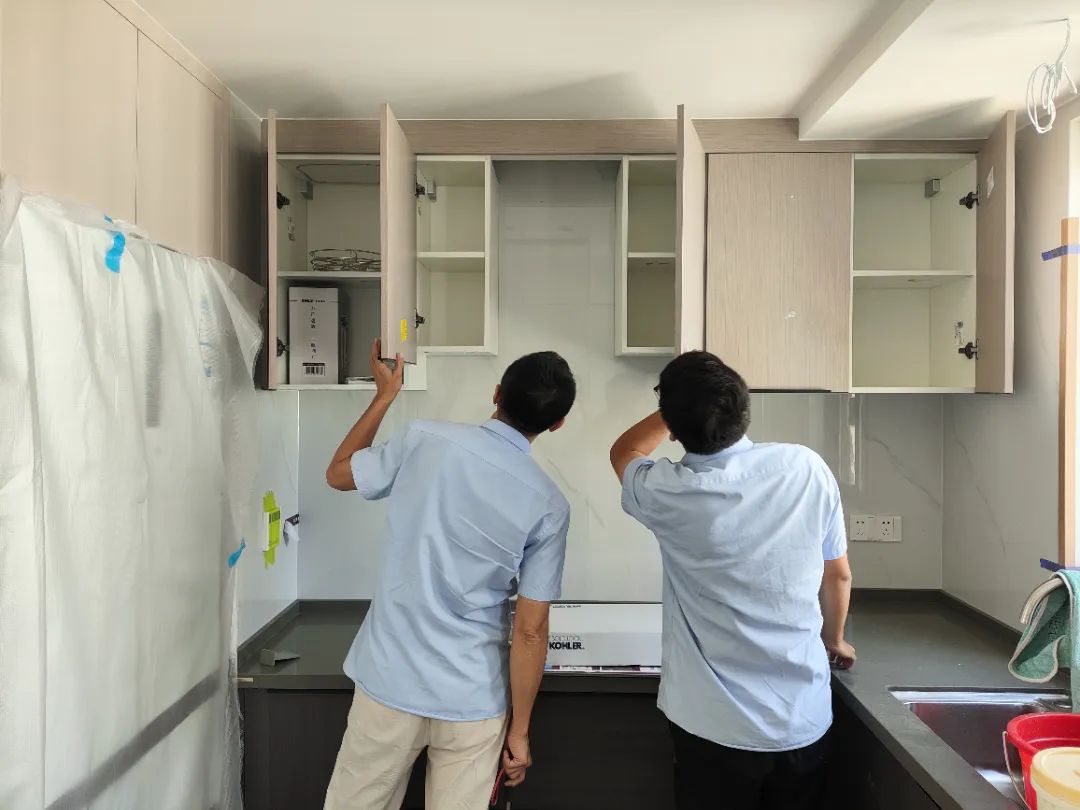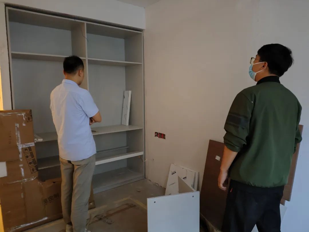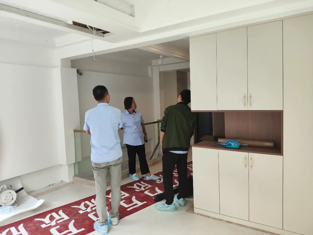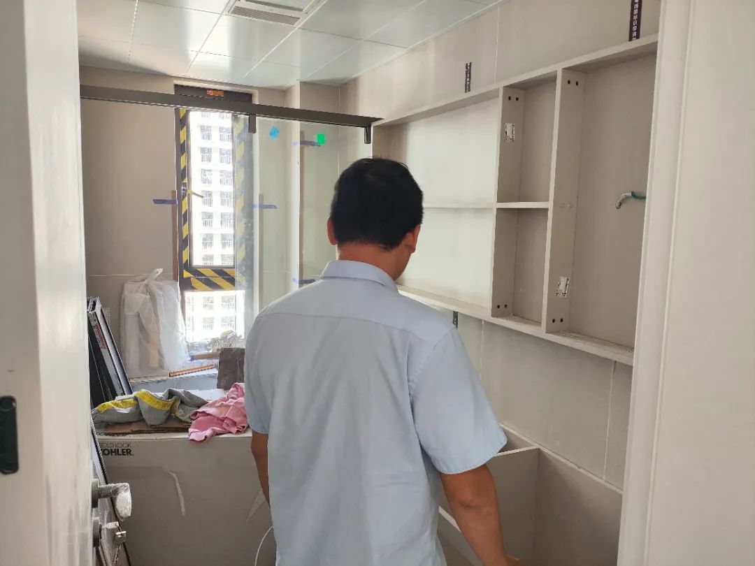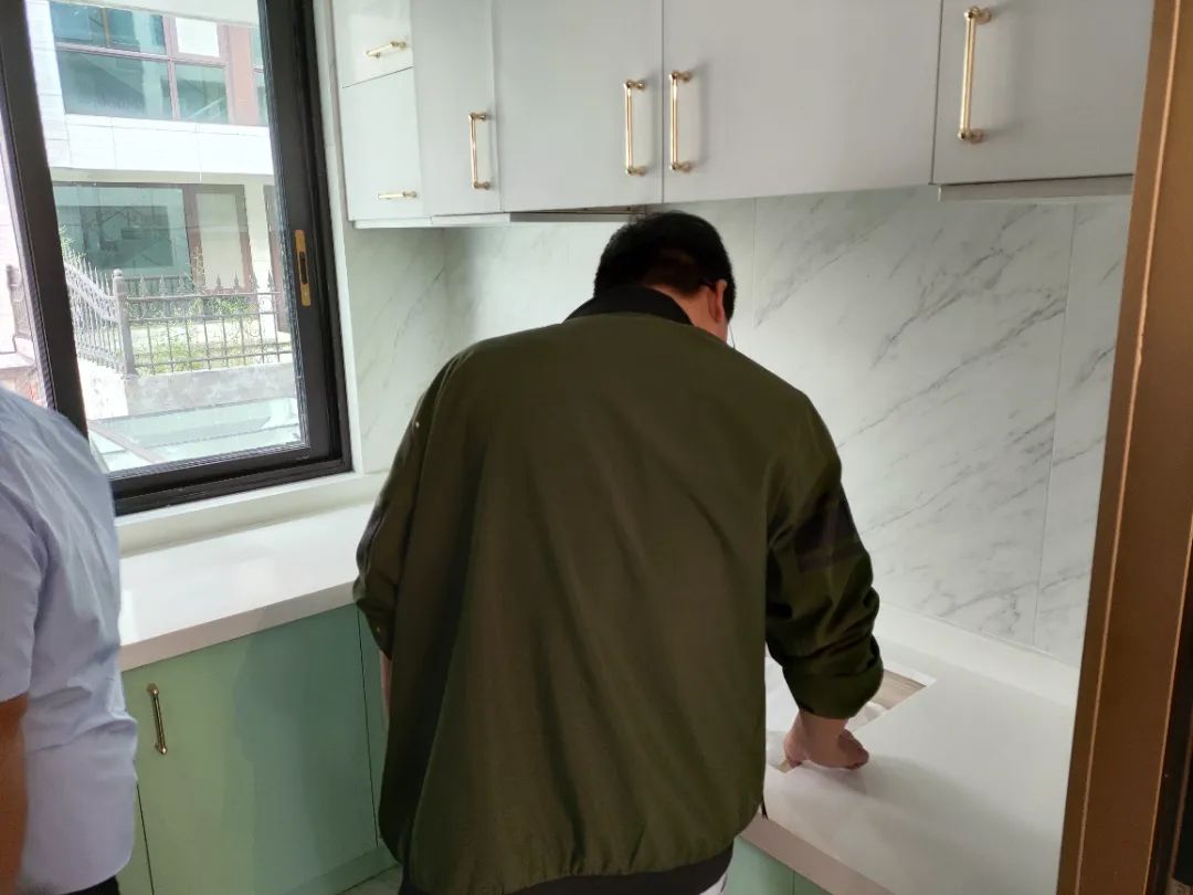 △現(xiàn)場(chǎng)對(duì)柜子進(jìn)行仔細(xì)檢查,確保業(yè)主入住后的正常使用。